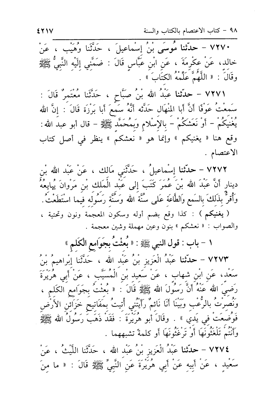 7271 - حَدَّثَنَا عَبْدُ اللَّهِ بْنُ صَبَّاحٍ، حَدَّثَنَا مُعْتَمِرٌ، قَالَ: سَمِعْتُ عَوْفًا، أَنَّ أَبَا المِنْهَالِ، حَدَّثَهُ أَنَّهُ سَمِعَ أَبَا بَرْزَةَ، قَالَ: «إِنَّ اللَّهَ يُغْنِيكُمْ - أَوْ نَعَشَكُمْ - بِالإِسْلاَمِ وَبِمُحَمَّدٍ صَلَّى اللهُ عَلَيْهِ وَسَلَّمَ»، قَالَ أَبُو عَبْدِ اللَّهِ: «وَقَعَ هَاهُنَا يُغْنِيكُمْ، وَإِنَّمَا هُوَ نَعَشَكُمْ يُنْظَرُ فِي أَصْلِ كِتَابِ الِاعْتِصَامِ».