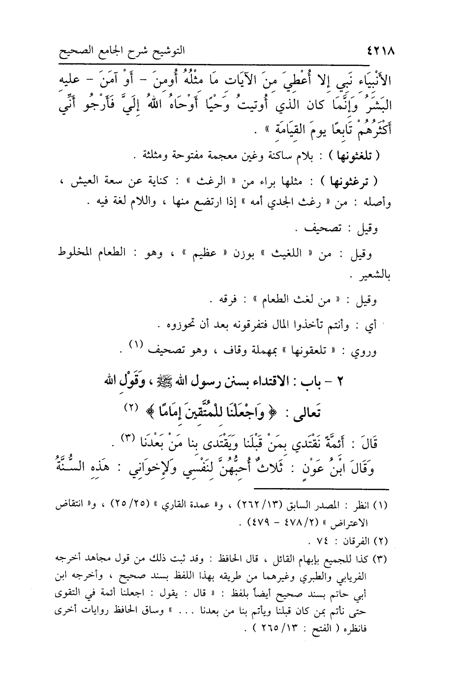 2 - بَابُ الِاقْتِدَاءِ بِسُنَنِ رَسُولِ اللَّهِ صَلَّى اللهُ عَلَيْهِ وَسَلَّمَ، وَقَوْلِ اللَّهِ تَعَالَى: {وَاجْعَلْنَا لِلْمُتَّقِينَ إِمَامًا} [الفرقان: 74]
