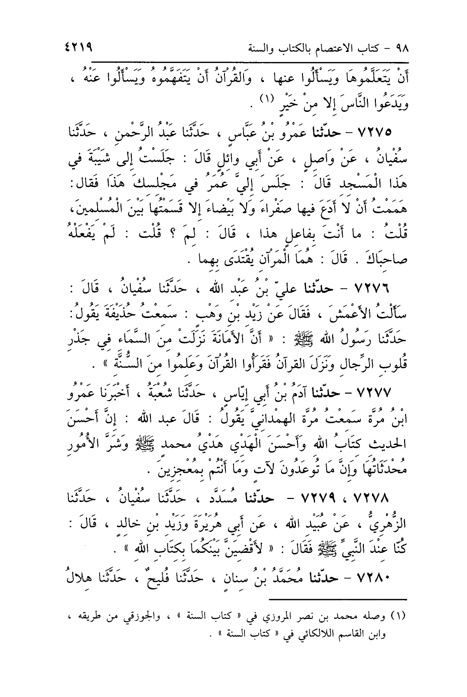 7275 - حَدَّثَنَا عَمْرُو بْنُ عَبَّاسٍ، حَدَّثَنَا عَبْدُ الرَّحْمَنِ، حَدَّثَنَا سُفْيَانُ، عَنْ وَاصِلٍ، عَنْ أَبِي وَائِلٍ قَالَ: جَلَسْتُ إِلَى شَيْبَةَ فِي هَذَا المَسْجِدِ، قَالَ: جَلَسَ إِلَيَّ عُمَرُ فِي مَجْلِسِكَ هَذَا، فَقَالَ: «لَقَدْ هَمَمْتُ أَنْ لاَ أَدَعَ فِيهَا صَفْرَاءَ وَلاَ بَيْضَاءَ إِلَّا قَسَمْتُهَا بَيْنَ المُسْلِمِينَ»، قُلْتُ: مَا أَنْتَ بِفَاعِلٍ، قَالَ: «لِمَ؟»، قُلْتُ: لَمْ يَفْعَلْهُ صَاحِبَاكَ، قَالَ: «هُمَا المَرْءَانِ يُقْتَدَى بِهِمَا».