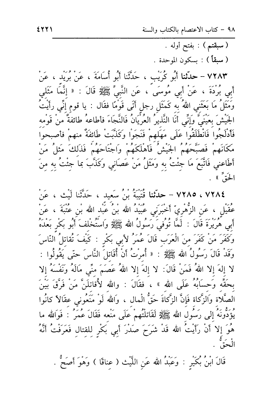 7284، 7285 - حَدَّثَنَا قُتَيْبَةُ بْنُ سَعِيدٍ، حَدَّثَنَا لَيْثٌ، عَنْ عُقَيْلٍ، عَنِ الزُّهْرِيِّ، أَخْبَرَنِي عُبَيْدُ اللَّهِ بْنُ عَبْدِ اللَّهِ بْنِ عُتْبَةَ، عَنْ أَبِي هُرَيْرَةَ، قَالَ: لَمَّا تُوُفِّيَ رَسُولُ اللَّهِ صَلَّى اللهُ عَلَيْهِ وَسَلَّمَ وَاسْتُخْلِفَ أَبُو بَكْرٍ بَعْدَهُ، وَكَفَرَ مَنْ كَفَرَ مِنَ العَرَبِ، قَالَ عُمَرُ لِأَبِي بَكْرٍ: كَيْفَ تُقَاتِلُ النَّاسَ؟ وَقَدْ قَالَ رَسُولُ اللَّهِ صَلَّى اللهُ عَلَيْهِ وَسَلَّمَ: "أُمِرْتُ أَنْ أُقَاتِلَ النَّاسَ حَتَّى يَقُولُوا: لاَ إِلَهَ إِلَّا اللَّهُ، فَمَنْ قَالَ: لاَ إِلَهَ إِلَّا اللَّهُ عَصَمَ مِنِّي مَالَهُ وَنَفْسَهُ، إِلَّا بِحَقِّهِ وَحِسَابُهُ عَلَى اللَّهِ"، فَقَالَ: وَاللَّهِ لَأُقَاتِلَنَّ مَنْ فَرَّقَ بَيْنَ الصَّلاَةِ وَالزَّكَاةِ، فَإِنَّ الزَّكَاةَ حَقُّ المَالِ، وَاللَّهِ لَوْ مَنَعُونِي عِقَالًا كَانُوا يُؤَدُّونَهُ إِلَى رَسُولِ اللَّهِ صَلَّى اللهُ عَلَيْهِ وَسَلَّمَ لَقَاتَلْتُهُمْ عَلَى مَنْعِهِ، فَقَالَ عُمَرُ: «فَوَاللَّهِ مَا هُوَ إِلَّا أَنْ رَأَيْتُ اللَّهَ قَدْ شَرَحَ صَدْرَ أَبِي بَكْرٍ لِلْقِتَالِ، فَعَرَفْتُ أَنَّهُ الحَقُّ»، قَالَ ابْنُ بُكَيْرٍ، وَعَبْدُ اللَّهِ عَنِ اللَّيْثِ عَنَاقًا وَهُوَ أَصَحُّ.