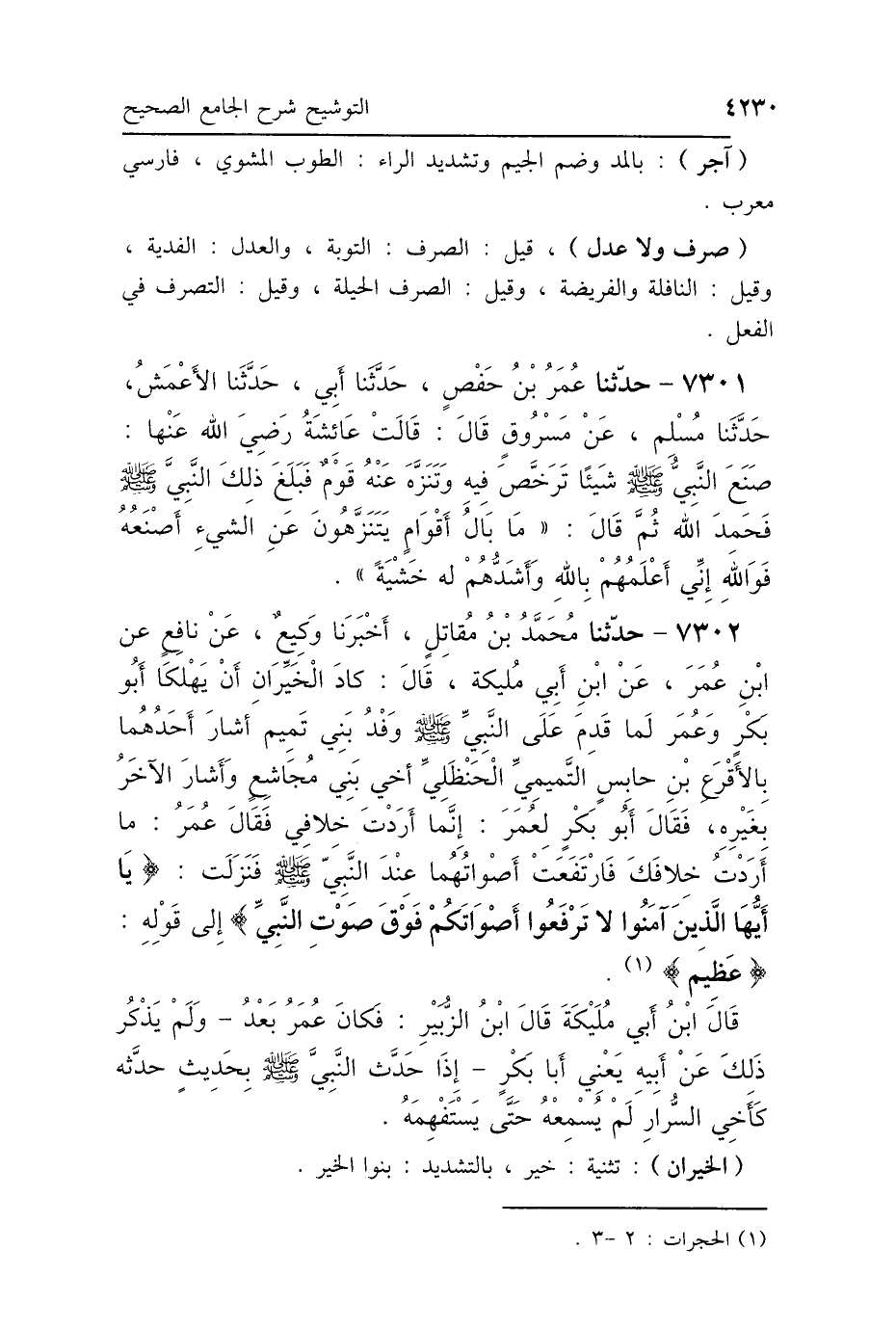 7302 - حَدَّثَنَا مُحَمَّدُ بْنُ مُقَاتِلٍ، أَخْبَرَنَا وَكِيعٌ، أَخْبَرَنَا نَافِعُ بْنُ عُمَرَ، عَنِ ابْنِ أَبِي مُلَيْكَةَ، قَالَ: كَادَ الخَيِّرَانِ أَنْ يَهْلِكَا أَبُو بَكْرٍ وَعُمَرُ، لَمَّا قَدِمَ عَلَى النَّبِيِّ صَلَّى اللهُ عَلَيْهِ وَسَلَّمَ وَفْدُ بَنِي تَمِيمٍ، أَشَارَ أَحَدُهُمَا بِالأَقْرَعِ بْنِ حَابِسٍ التَّمِيمِيِّ الحَنْظَلِيِّ أَخِي بَنِي مُجَاشِعٍ، وَأَشَارَ الآخَرُ بِغَيْرِهِ، فَقَالَ أَبُو بَكْرٍ لِعُمَرَ: إِنَّمَا أَرَدْتَ خِلاَفِي، فَقَالَ عُمَرُ: مَا أَرَدْتُ خِلاَفَكَ، فَارْتَفَعَتْ أَصْوَاتُهُمَا عِنْدَ النَّبِيِّ صَلَّى اللهُ عَلَيْهِ وَسَلَّمَ، فَنَزَلَتْ: {يَا أَيُّهَا الَّذِينَ آمَنُوا لاَ تَرْفَعُوا أَصْوَاتَكُمْ فَوْقَ صَوْتِ النَّبِيِّ} [الحجرات: 2] إِلَى قَوْلِهِ {عَظِيمٌ} [الحجرات: 3]، قَالَ ابْنُ أَبِي مُلَيْكَةَ، قَالَ ابْنُ الزُّبَيْرِ، فَكَانَ عُمَرُ بَعْدُ، وَلَمْ يَذْكُرْ ذَلِكَ عَنْ أَبِيهِ يَعْنِي أَبَا بَكْرٍ، إِذَا حَدَّثَ النَّبِيَّ صَلَّى اللهُ عَلَيْهِ وَسَلَّمَ بِحَدِيثٍ حَدَّثَهُ كَأَخِي السِّرَارِ لَمْ يُسْمِعْهُ حَتَّى يَسْتَفْهِمَهُ.