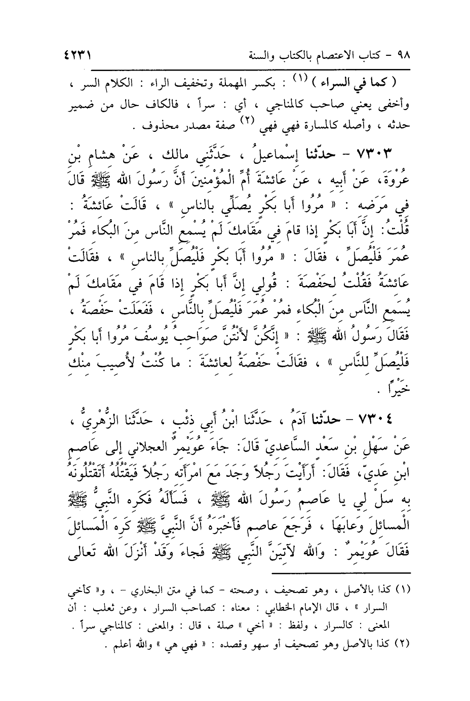7303 - حَدَّثَنَا إِسْمَاعِيلُ، حَدَّثَنِي مَالِكٌ، عَنْ هِشَامِ بْنِ عُرْوَةَ، عَنْ أَبِيهِ، عَنْ عَائِشَةَ، أُمِّ المُؤْمِنِينَ: أَنَّ رَسُولَ اللَّهِ صَلَّى اللهُ عَلَيْهِ وَسَلَّمَ قَالَ فِي مَرَضِهِ: «مُرُوا أَبَا بَكْرٍ يُصَلِّي بِالنَّاسِ»، قَالَتْ عَائِشَةُ: قُلْتُ: إِنَّ أَبَا بَكْرٍ إِذَا قَامَ فِي مَقَامِكَ لَمْ يُسْمِعِ النَّاسَ مِنَ البُكَاءِ، فَمُرْ عُمَرَ فَلْيُصَلِّ لِلنَّاسِ، فَقَالَ: «مُرُوا أَبَا بَكْرٍ فَلْيُصَلِّ بِالنَّاسِ»، فَقَالَتْ عَائِشَةُ: فَقُلْتُ لِحَفْصَةَ: قُولِي إِنَّ أَبَا بَكْرٍ إِذَا قَامَ فِي مَقَامِكَ لَمْ يُسْمِعِ النَّاسَ مِنَ البُكَاءِ، فَمُرْ عُمَرَ فَلْيُصَلِّ بِالنَّاسِ، فَفَعَلَتْ حَفْصَةُ، فَقَالَ رَسُولُ اللَّهِ صَلَّى اللهُ عَلَيْهِ وَسَلَّمَ: «إِنَّكُنَّ لَأَنْتُنَّ صَوَاحِبُ يُوسُفَ، مُرُوا أَبَا بَكْرٍ فَلْيُصَلِّ لِلنَّاسِ»، فَقَالَتْ حَفْصَةُ لِعَائِشَةَ: مَا كُنْتُ لِأُصِيبَ مِنْكِ خَيْرًا.
