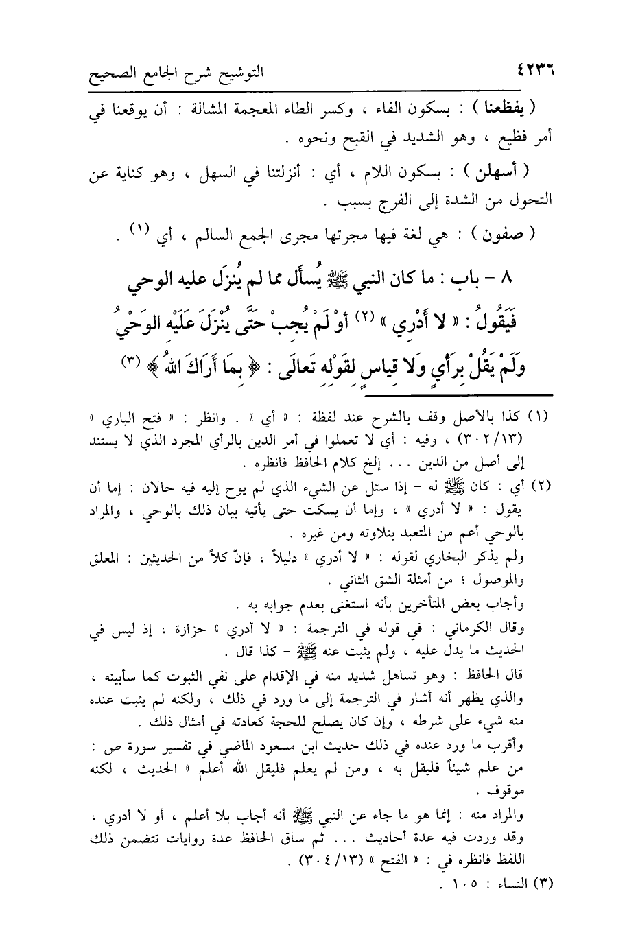 8 - بَابُ مَا كَانَ النَّبِيُّ صَلَّى اللهُ عَلَيْهِ وَسَلَّمَ يُسْأَلُ مِمَّا لَمْ يُنْزَلْ عَلَيْهِ الوَحْيُ، فَيَقُولُ: «لاَ أَدْرِي»، أَوْ لَمْ يُجِبْ حَتَّى يُنْزَلَ عَلَيْهِ الوَحْيُ، وَلَمْ يَقُلْ بِرَأْيٍ وَلاَ بِقِيَاسٍ لِقَوْلِهِ تَعَالَى: {بِمَا أَرَاكَ اللَّهُ} [النساء: 105]