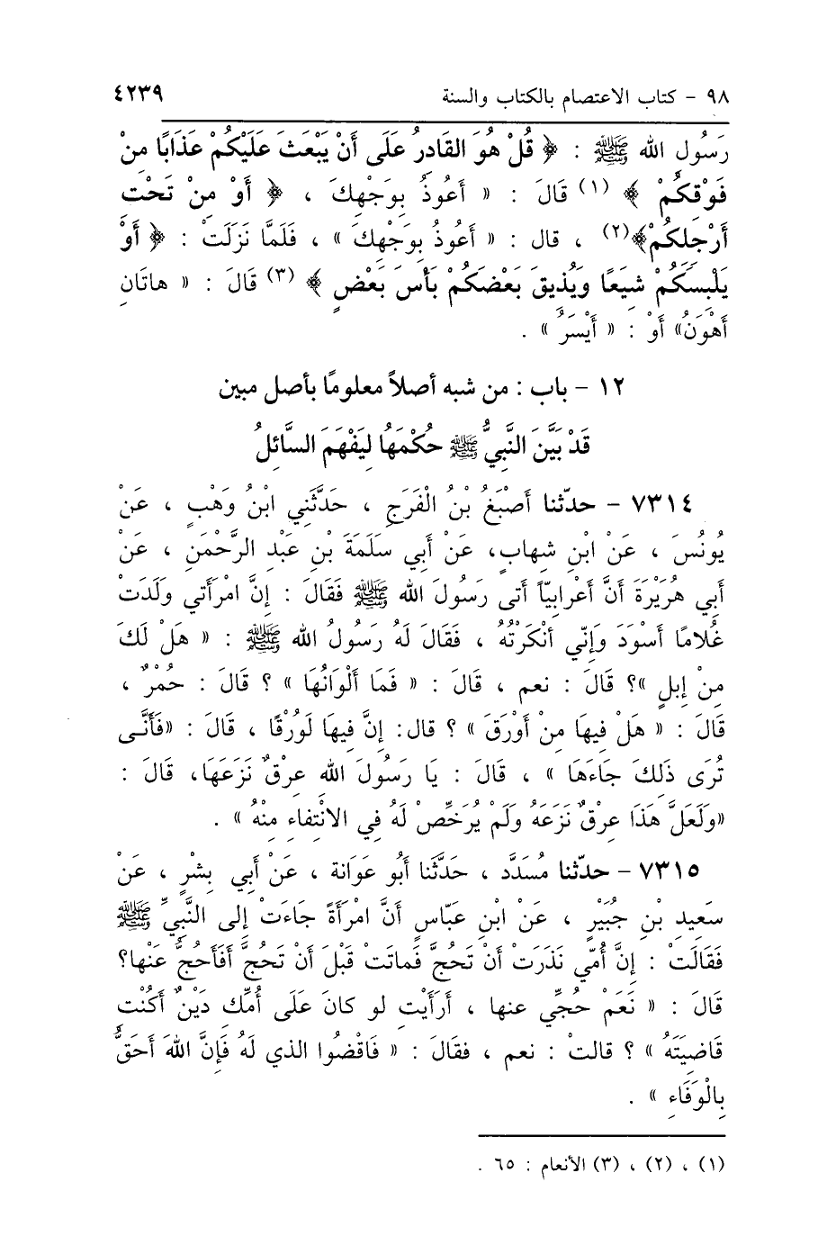 7314 - حَدَّثَنَا أَصْبَغُ بْنُ الفَرَجِ، حَدَّثَنِي ابْنُ وَهْبٍ، عَنْ يُونُسَ، عَنِ ابْنِ شِهَابٍ، عَنْ أَبِي سَلَمَةَ بْنِ عَبْدِ الرَّحْمَنِ، عَنْ أَبِي هُرَيْرَةَ: أَنَّ أَعْرَابِيًّا أَتَى رَسُولَ اللَّهِ صَلَّى اللهُ عَلَيْهِ وَسَلَّمَ، فَقَالَ: إِنَّ امْرَأَتِي وَلَدَتْ غُلاَمًا أَسْوَدَ، وَإِنِّي أَنْكَرْتُهُ، فَقَالَ لَهُ رَسُولُ اللَّهِ صَلَّى اللهُ عَلَيْهِ وَسَلَّمَ: «هَلْ لَكَ مِنْ إِبِلٍ؟»، قَالَ: نَعَمْ، قَالَ: «فَمَا أَلْوَانُهَا؟»، قَالَ: حُمْرٌ، قَالَ: «هَلْ فِيهَا مِنْ أَوْرَقَ؟»، قَالَ: إِنَّ فِيهَا لَوُرْقًا، قَالَ: «فَأَنَّى تُرَى ذَلِكَ جَاءَهَا»، قَالَ: يَا رَسُولَ اللَّهِ، عِرْقٌ نَزَعَهَا، قَالَ: «وَلَعَلَّ هَذَا عِرْقٌ نَزَعَهُ»، وَلَمْ يُرَخِّصْ لَهُ فِي الِانْتِفَاءِ مِنْهُ.