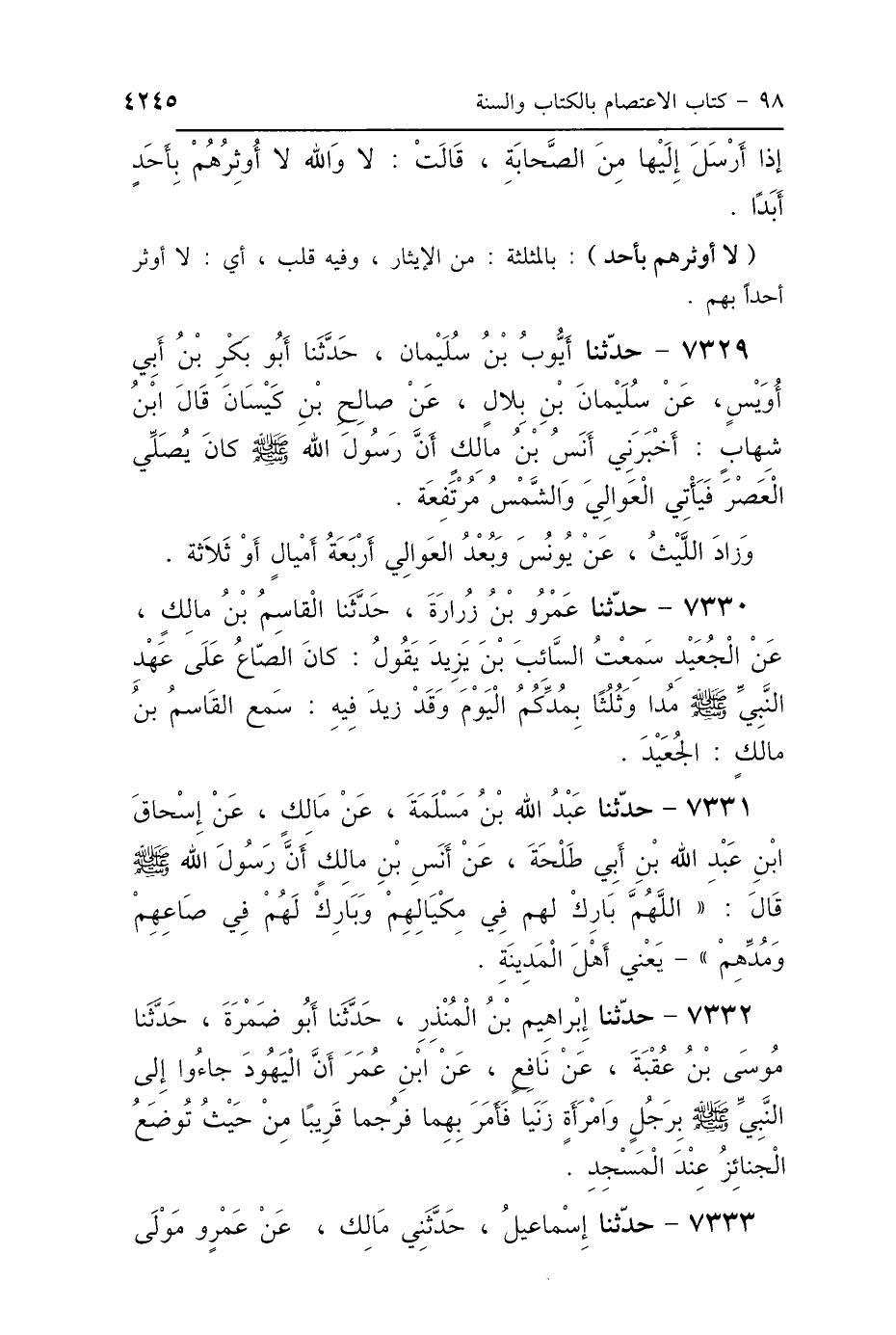 7329 - حَدَّثَنَا أَيُّوبُ بْنُ سُلَيْمَانَ، حَدَّثَنَا أَبُو بَكْرِ بْنُ أَبِي أُوَيْسٍ، عَنْ سُلَيْمَانَ بْنِ بِلاَلٍ، عَنْ صَالِحِ بْنِ كَيْسَانَ، قَالَ ابْنُ شِهَابٍ: أَخْبَرَنِي أَنَسُ بْنُ مَالِكٍ: «أَنَّ رَسُولَ اللَّهِ صَلَّى اللهُ عَلَيْهِ وَسَلَّمَ كَانَ يُصَلِّي العَصْرَ، فَيَأْتِي العَوَالِيَ وَالشَّمْسُ مُرْتَفِعَةٌ»، وَزَادَ اللَّيْثُ، عَنْ يُونُسَ: وَبُعْدُ العَوَالِيَ أَرْبَعَةُ أَمْيَالٍ أَوْ ثَلاَثَةٌ.
