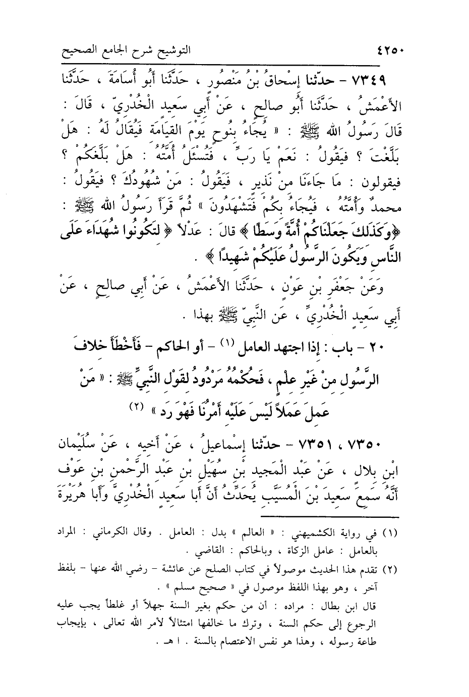 7349 - حَدَّثَنَا إِسْحَاقُ بْنُ مَنْصُورٍ، حَدَّثَنَا أَبُو أُسَامَةَ، حَدَّثَنَا الأَعْمَشُ، حَدَّثَنَا أَبُو صَالِحٍ، عَنْ أَبِي سَعِيدٍ الخُدْرِيِّ، قَالَ: قَالَ رَسُولُ اللَّهِ صَلَّى اللهُ عَلَيْهِ وَسَلَّمَ: " يُجَاءُ بِنُوحٍ يَوْمَ القِيَامَةِ، فَيُقَالُ لَهُ: هَلْ بَلَّغْتَ؟ فَيَقُولُ: نَعَمْ، يَا رَبِّ، فَتُسْأَلُ أُمَّتُهُ: هَلْ بَلَّغَكُمْ؟ فَيَقُولُونَ: مَا جَاءَنَا مِنْ نَذِيرٍ، فَيَقُولُ: مَنْ شُهُودُكَ؟ فَيَقُولُ: مُحَمَّدٌ وَأُمَّتُهُ، فَيُجَاءُ بِكُمْ، فَتَشْهَدُونَ "، ثُمَّ قَرَأَ رَسُولُ اللَّهِ صَلَّى اللهُ عَلَيْهِ وَسَلَّمَ {وَكَذَلِكَ جَعَلْنَاكُمْ أُمَّةً وَسَطًا} [البقرة: 143]- قَالَ: عَدْلًا - {لِتَكُونُوا شُهَدَاءَ عَلَى النَّاسِ، وَيَكُونَ الرَّسُولُ عَلَيْكُمْ شَهِيدًا} [البقرة: 143]، وَعَنْ جَعْفَرِ بْنِ عَوْنٍ، حَدَّثَنَا الأَعْمَشُ، عَنْ أَبِي صَالِحٍ، عَنْ أَبِي سَعِيدٍ الخُدْرِيِّ، عَنِ النَّبِيِّ صَلَّى اللهُ عَلَيْهِ وَسَلَّمَ بِهَذَا.