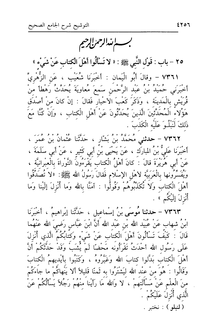 25 - بَابُ قَوْلِ النَّبِيِّ صَلَّى اللهُ عَلَيْهِ وَسَلَّمَ: «لاَ تَسْأَلُوا أَهْلَ الكِتَابِ عَنْ شَيْءٍ»