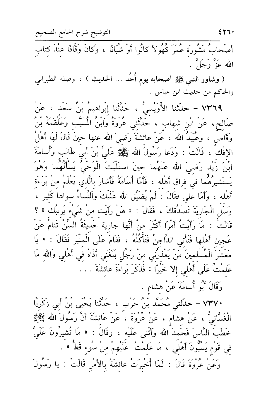 7370 - حَدَّثَنِي مُحَمَّدُ بْنُ حَرْبٍ، حَدَّثَنَا يَحْيَى بْنُ أَبِي زَكَرِيَّاءَ الغَسَّانِيُّ، عَنْ هِشَامٍ، عَنْ عُرْوَةَ، عَنْ عَائِشَةَ: "أَنَّ رَسُولَ اللَّهِ صَلَّى اللهُ عَلَيْهِ وَسَلَّمَ خَطَبَ النَّاسَ فَحَمِدَ اللَّهَ وَأَثْنَى عَلَيْهِ وَقَالَ: مَا تُشِيرُونَ عَلَيَّ فِي قَوْمٍ يَسُبُّونَ أَهْلِي، مَا عَلِمْتُ عَلَيْهِمْ مِنْ سُوءٍ قَطُّ"، وَعَنْ عُرْوَةَ قَالَ: لَمَّا أُخْبِرَتْ عَائِشَةُ بِالأَمْرِ، قَالَتْ: يَا رَسُولَ اللَّهِ،
