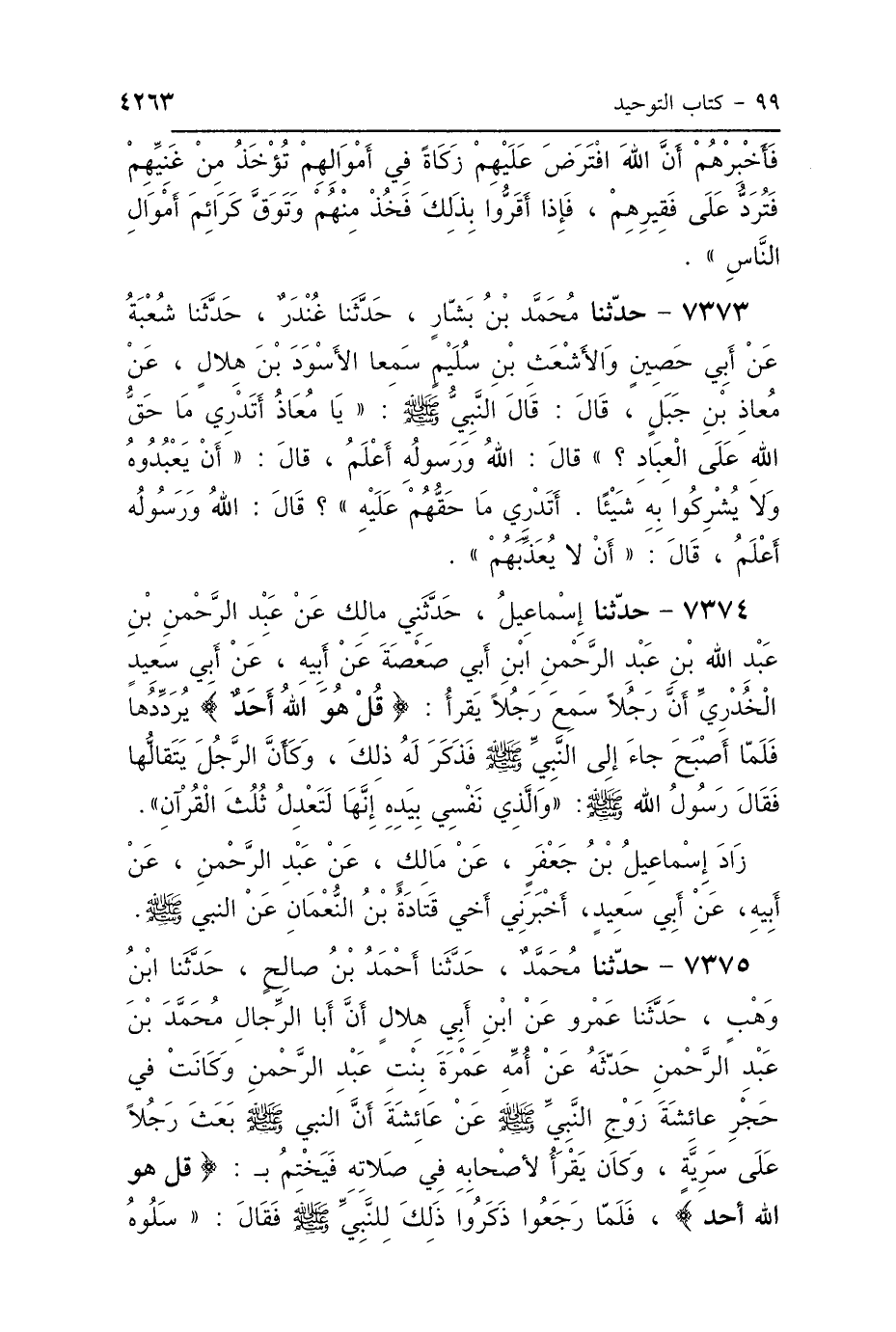 7374 - حَدَّثَنَا إِسْمَاعِيلُ، حَدَّثَنِي مَالِكٌ، عَنْ عَبْدِ الرَّحْمَنِ بْنِ عَبْدِ اللَّهِ بْنِ عَبْدِ الرَّحْمَنِ بْنِ أَبِي صَعْصَعَةَ، عَنْ أَبِيهِ، عَنْ أَبِي سَعِيدٍ الخُدْرِيِّ، أَنَّ رَجُلًا سَمِعَ رَجُلًا يَقْرَأُ قُلْ هُوَ اللَّهُ أَحَدٌ يُرَدِّدُهَا، فَلَمَّا أَصْبَحَ جَاءَ إِلَى النَّبِيِّ صَلَّى اللهُ عَلَيْهِ وَسَلَّمَ فَذَكَرَ لَهُ ذَلِكَ، وَكَأَنَّ الرَّجُلَ يَتَقَالُّهَا، فَقَالَ رَسُولُ اللَّهِ صَلَّى اللهُ عَلَيْهِ وَسَلَّمَ: «وَالَّذِي نَفْسِي بِيَدِهِ، إِنَّهَا لَتَعْدِلُ ثُلُثَ القُرْآنِ» زَادَ إِسْمَاعِيلُ بْنُ جَعْفَرٍ، عَنْ مَالِكٍ، عَنْ عَبْدِ الرَّحْمَنِ، عَنْ أَبِيهِ، عَنْ أَبِي سَعِيدٍ، أَخْبَرَنِي أَخِي قَتَادَةُ بْنُ النُّعْمَانِ عَنِ النَّبِيِّ صَلَّى اللهُ عَلَيْهِ وَسَلَّمَ.