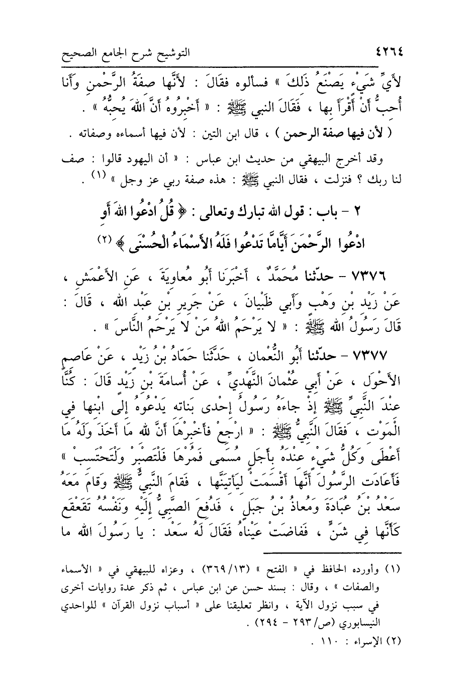 2 - بَابُ قَوْلِ اللَّهِ تَبَارَكَ وَتَعَالَى: {قُلِ ادْعُوا اللَّهَ أَوِ ادْعُوا الرَّحْمَنَ أَيًّا مَا تَدْعُوا فَلَهُ الأَسْمَاءُ الحُسْنَى} [الإسراء: 110]