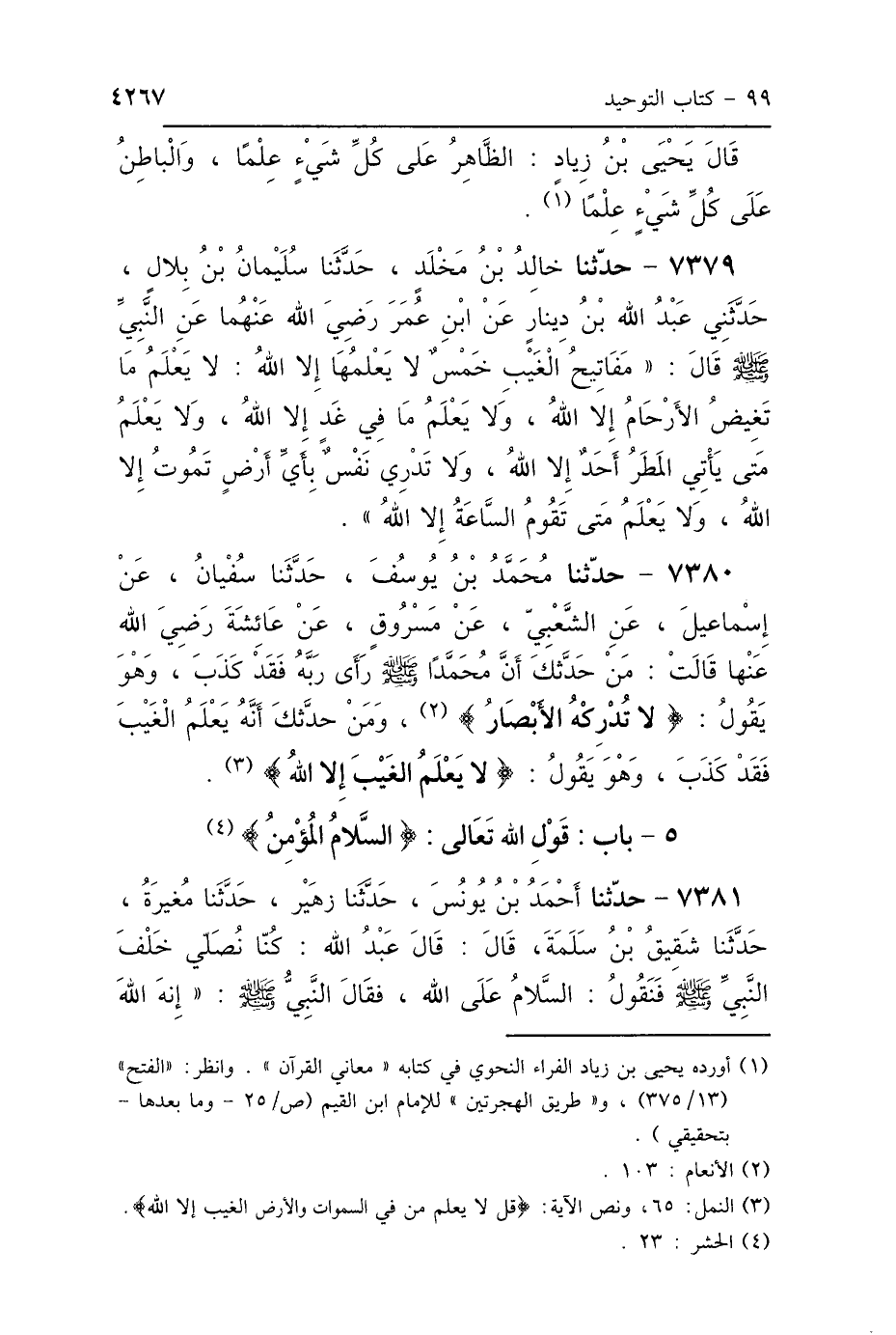 7380 - حَدَّثَنَا مُحَمَّدُ بْنُ يُوسُفَ، حَدَّثَنَا سُفْيَانُ، عَنْ إِسْمَاعِيلَ، عَنِ الشَّعْبِيِّ، عَنْ مَسْرُوقٍ، عَنْ عَائِشَةَ رَضِيَ اللَّهُ عَنْهَا، قَالَتْ: «مَنْ حَدَّثَكَ أَنَّ مُحَمَّدًا صَلَّى اللهُ عَلَيْهِ وَسَلَّمَ رَأَى رَبَّهُ، فَقَدْ كَذَبَ، وَهُوَ يَقُولُ»: {لاَ تُدْرِكُهُ الأَبْصَارُ} [الأنعام: 103]، «وَمَنْ حَدَّثَكَ أَنَّهُ يَعْلَمُ الغَيْبَ، فَقَدْ كَذَبَ، وَهُوَ يَقُولُ»: لاَ يَعْلَمُ الغَيْبَ إِلَّا اللَّهُ".