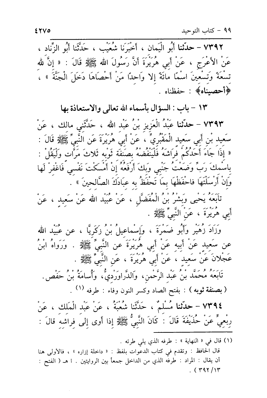 7392 - حَدَّثَنَا أَبُو اليَمَانِ، أَخْبَرَنَا شُعَيْبٌ، حَدَّثَنَا أَبُو الزِّنَادِ، عَنِ الأَعْرَجِ، عَنْ أَبِي هُرَيْرَةَ: أَنَّ رَسُولَ اللَّهِ صَلَّى اللهُ عَلَيْهِ وَسَلَّمَ قَالَ: «إِنَّ لِلَّهِ تِسْعَةً وَتِسْعِينَ اسْمًا، مِائَةً إِلَّا وَاحِدًا، مَنْ أَحْصَاهَا دَخَلَ الجَنَّةَ» أَحْصَيْنَاهُ حَفِظْنَاهُ.