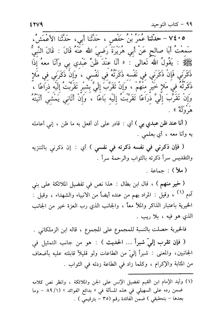 7405 - حَدَّثَنَا عُمَرُ بْنُ حَفْصٍ، حَدَّثَنَا أَبِي، حَدَّثَنَا الأَعْمَشُ، سَمِعْتُ أَبَا صَالِحٍ، عَنْ أَبِي هُرَيْرَةَ رَضِيَ اللَّهُ عَنْهُ، قَالَ: قَالَ النَّبِيُّ صَلَّى اللهُ عَلَيْهِ وَسَلَّمَ: " يَقُولُ اللَّهُ تَعَالَى: أَنَا عِنْدَ ظَنِّ عَبْدِي بِي، وَأَنَا مَعَهُ إِذَا ذَكَرَنِي، فَإِنْ ذَكَرَنِي فِي نَفْسِهِ ذَكَرْتُهُ فِي نَفْسِي، وَإِنْ ذَكَرَنِي فِي مَلَإٍ ذَكَرْتُهُ فِي مَلَإٍ خَيْرٍ مِنْهُمْ، وَإِنْ تَقَرَّبَ إِلَيَّ بِشِبْرٍ تَقَرَّبْتُ إِلَيْهِ ذِرَاعًا، وَإِنْ تَقَرَّبَ إِلَيَّ ذِرَاعًا تَقَرَّبْتُ إِلَيْهِ بَاعًا، وَإِنْ أَتَانِي يَمْشِي أَتَيْتُهُ هَرْوَلَةً".