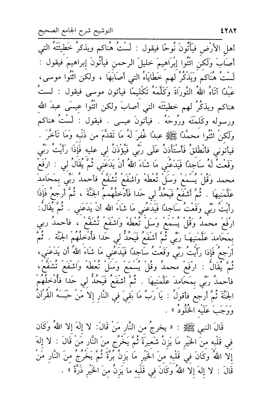 أَهْلِ الأَرْضِ، فَيَأْتُونَ نُوحًا، فَيَقُولُ: لَسْتُ هُنَاكُمْ، وَيَذْكُرُ خَطِيئَتَهُ الَّتِي أَصَابَ، وَلَكِنِ ائْتُوا إِبْرَاهِيمَ خَلِيلَ الرَّحْمَنِ، فَيَأْتُونَ إِبْرَاهِيمَ فَيَقُولُ: لَسْتُ هُنَاكُمْ، وَيَذْكُرُ لَهُمْ خَطَايَاهُ الَّتِي أَصَابَهَا، وَلَكِنِ ائْتُوا مُوسَى، عَبْدًا آتَاهُ اللَّهُ التَّوْرَاةَ، وَكَلَّمَهُ تَكْلِيمًا، فَيَأْتُونَ مُوسَى فَيَقُولُ: لَسْتُ هُنَاكُمْ، وَيَذْكُرُ لَهُمْ خَطِيئَتَهُ الَّتِي أَصَابَ، وَلَكِنِ ائْتُوا عِيسَى عَبْدَ اللَّهِ وَرَسُولَهُ، وَكَلِمَتَهُ وَرُوحَهُ، فَيَأْتُونَ عِيسَى، فَيَقُولُ: لَسْتُ هُنَاكُمْ، وَلَكِنِ ائْتُوا مُحَمَّدًا صَلَّى اللهُ عَلَيْهِ وَسَلَّمَ، عَبْدًا غُفِرَ لَهُ مَا تَقَدَّمَ مِنْ ذَنْبهِ وَمَا تَأَخَّرَ، فَيَأْتُونِي، فَأَنْطَلِقُ، فَأَسْتَأْذِنُ عَلَى رَبِّي، فَيُؤْذَنُ لِي عَلَيْهِ، فَإِذَا رَأَيْتُ رَبِّي وَقَعْتُ لَهُ سَاجِدًا، فَيَدَعُنِي مَا شَاءَ اللَّهُ أَنْ يَدَعَنِي، ثُمَّ يُقَالُ لِي: ارْفَعْ مُحَمَّدُ وَقُلْ يُسْمَعْ، وَسَلْ تُعْطَهْ، وَاشْفَعْ تُشَفَّعْ، فَأَحْمَدُ رَبِّي بِمَحَامِدَ عَلَّمَنِيهَا، ثُمَّ أَشْفَعُ فَيَحُدُّ لِي حَدًّا، فَأُدْخِلُهُمُ الجَنَّةَ، ثُمَّ أَرْجِعُ، فَإِذَا رَأَيْتُ رَبِّي وَقَعْتُ سَاجِدًا، فَيَدَعُنِي مَا شَاءَ اللَّهُ أَنْ يَدَعَنِي، ثُمَّ يُقَالُ: ارْفَعْ مُحَمَّدُ وَقُلْ يُسْمَعْ، وَسَلْ تُعْطَهْ، وَاشْفَعْ تُشَفَّعْ، فَأَحْمَدُ رَبِّي بِمَحَامِدَ عَلَّمَنِيهَا رَبِّي، ثُمَّ أَشْفَعُ فَيَحُدُّ لِي حَدًّا، فَأُدْخِلُهُمُ الجَنَّةَ، ثُمَّ أَرْجِعُ، فَإِذَا رَأَيْتُ رَبِّي وَقَعْتُ سَاجِدًا، فَيَدَعُنِي مَا شَاءَ اللَّهُ أَنْ يَدَعَنِي، ثُمَّ يُقَالُ: ارْفَعْ مُحَمَّدُ، قُلْ يُسْمَعْ، وَسَلْ تُعْطَهْ، وَاشْفَعْ تُشَفَّعْ، فَأَحْمَدُ رَبِّي بِمَحَامِدَ عَلَّمَنِيهَا، ثُمَّ أَشْفَعْ، فَيَحُدُّ لِي حَدًّا فَأُدْخِلُهُمُ الجَنَّةَ، ثُمَّ أَرْجِعُ فَأَقُولُ: يَا رَبِّ مَا بَقِيَ فِي النَّارِ إِلَّا مَنْ حَبَسَهُ القُرْآنُ، وَوَجَبَ عَلَيْهِ الخُلُودُ، قَالَ النَّبِيُّ صَلَّى اللهُ عَلَيْهِ وَسَلَّمَ: يَخْرُجُ مِنَ النَّارِ مَنْ قَالَ: لاَ إِلَهَ إِلَّا اللَّهُ وَكَانَ فِي قَلْبِهِ مِنَ الخَيْرِ مَا يَزِنُ شَعِيرَةً، ثُمَّ يَخْرُجُ مِنَ النَّارِ مَنْ قَالَ: لاَ إِلَهَ إِلَّا اللَّهُ وَكَانَ فِي قَلْبِهِ مِنَ الخَيْرِ مَا يَزِنُ بُرَّةً، ثُمَّ يَخْرُجُ مِنَ النَّارِ مَنْ قَالَ: لاَ إِلَهَ إِلَّا اللَّهُ وَكَانَ فِي قَلْبِهِ مَا يَزِنُ مِنَ الخَيْرِ ذَرَّةً".