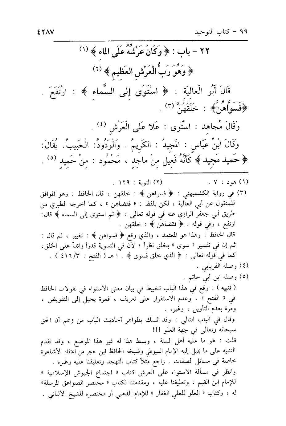 قَالَ أَبُو العَالِيَةِ: {اسْتَوَى إِلَى السَّمَاءِ} [البقرة: 29]: «ارْتَفَعَ»، {فَسَوَّاهُنَّ} [البقرة: 29]: «خَلَقَهُنَّ» وَقَالَ مُجَاهِدٌ: {اسْتَوَى} [البقرة: 29]: «عَلاَ» {عَلَى العَرْشِ} [الأعراف: 54] وَقَالَ ابْنُ عَبَّاسٍ: {المَجِيدُ} [ق: 1]: «الكَرِيمُ»، وَ {الوَدُودُ} [البروج: 14]: «الحَبِيبُ»، يُقَالُ: «حَمِيدٌ مَجِيدٌ، كَأَنَّهُ فَعِيلٌ مِنْ مَاجِدٍ، مَحْمُودٌ مِنْ حَمِدَ».