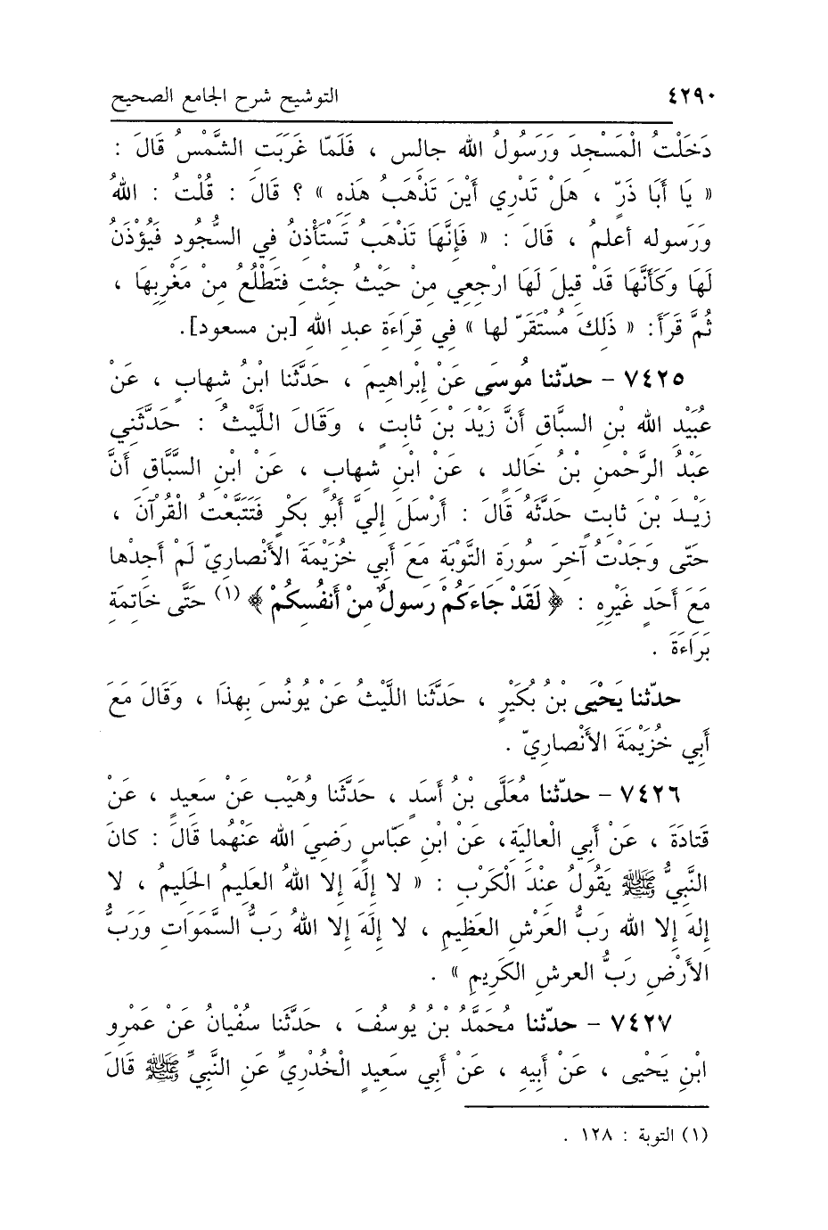 7425 - حَدَّثَنَا مُوسَى، عَنْ إِبْرَاهِيمَ، حَدَّثَنَا ابْنُ شِهَابٍ، عَنْ عُبَيْدِ بْنِ السَّبَّاقِ، أَنَّ زَيْدَ بْنَ ثَابِتٍ، وَقَالَ اللَّيْثُ: حَدَّثَنِي عَبْدُ الرَّحْمَنِ بْنُ خَالِدٍ، عَنِ ابْنِ شِهَابٍ، عَنِ ابْنِ السَّبَّاقِ، أَنَّ زَيْدَ بْنَ ثَابِتٍ، حَدَّثَهُ قَالَ: «أَرْسَلَ إِلَيَّ أَبُو بَكْرٍ فَتَتَبَّعْتُ القُرْآنَ، حَتَّى وَجَدْتُ آخِرَ سُورَةِ التَّوْبَةِ مَعَ أَبِي خُزَيْمَةَ الأَنْصَارِيِّ، لَمْ أَجِدْهَا مَعَ أَحَدٍ غَيْرِهِ»، {لَقَدْ جَاءَكُمْ رَسُولٌ مِنْ أَنْفُسِكُمْ} [التوبة: 128] حَتَّى خَاتِمَةِ بَرَاءَةَ. حَدَّثَنَا يَحْيَى بْنُ بُكَيْرٍ، حَدَّثَنَا اللَّيْثُ، عَنْ يُونُسَ بِهَذَا، وَقَالَ: مَعَ أَبِي خُزَيْمَةَ الأَنْصَارِيِّ.