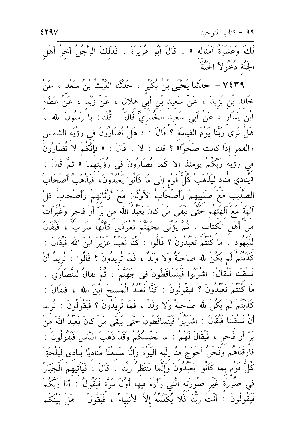 7439 - حَدَّثَنَا يَحْيَى بْنُ بُكَيْرٍ، حَدَّثَنَا اللَّيْثُ بْنُ سَعْدٍ، عَنْ خَالِدِ بْنِ يَزِيدَ، عَنْ سَعِيدِ بْنِ أَبِي هِلاَلٍ، عَنْ زَيْدٍ، عَنْ عَطَاءِ بْنِ يَسَارٍ، عَنْ أَبِي سَعِيدٍ الخُدْرِيِّ، قَالَ: قُلْنَا يَا رَسُولَ اللَّهِ هَلْ نَرَى رَبَّنَا يَوْمَ القِيَامَةِ؟ قَالَ: «هَلْ تُضَارُونَ فِي رُؤْيَةِ الشَّمْسِ وَالقَمَرِ إِذَا كَانَتْ صَحْوًا؟»، قُلْنَا: لاَ، قَالَ: «فَإِنَّكُمْ لاَ تُضَارُونَ فِي رُؤْيَةِ رَبِّكُمْ يَوْمَئِذٍ، إِلَّا كَمَا تُضَارُونَ فِي رُؤْيَتِهِمَا» ثُمَّ قَالَ: " يُنَادِي مُنَادٍ: لِيَذْهَبْ كُلُّ قَوْمٍ إِلَى مَا كَانُوا يَعْبُدُونَ، فَيَذْهَبُ أَصْحَابُ الصَّلِيبِ مَعَ صَلِيبِهِمْ، وَأَصْحَابُ الأَوْثَانِ مَعَ أَوْثَانِهِمْ، وَأَصْحَابُ كُلِّ آلِهَةٍ مَعَ آلِهَتِهِمْ، حَتَّى يَبْقَى مَنْ كَانَ يَعْبُدُ اللَّهَ، مِنْ بَرٍّ أَوْ فَاجِرٍ، وَغُبَّرَاتٌ مِنْ أَهْلِ الكِتَابِ، ثُمَّ يُؤْتَى بِجَهَنَّمَ تُعْرَضُ كَأَنَّهَا سَرَابٌ، فَيُقَالُ لِلْيَهُودِ: مَا كُنْتُمْ تَعْبُدُونَ؟ قَالُوا: كُنَّا نَعْبُدُ عُزَيْرَ ابْنَ اللَّهِ، فَيُقَالُ: كَذَبْتُمْ، لَمْ يَكُنْ لِلَّهِ صَاحِبَةٌ وَلاَ وَلَدٌ، فَمَا تُرِيدُونَ؟ قَالُوا: نُرِيدُ أَنْ تَسْقِيَنَا، فَيُقَالُ: اشْرَبُوا، فَيَتَسَاقَطُونَ فِي جَهَنَّمَ، ثُمَّ يُقَالُ لِلنَّصَارَى: مَا كُنْتُمْ تَعْبُدُونَ؟ فَيَقُولُونَ: كُنَّا نَعْبُدُ المَسِيحَ ابْنَ اللَّهِ، فَيُقَالُ: كَذَبْتُمْ، لَمْ يَكُنْ لِلَّهِ صَاحِبَةٌ، وَلاَ وَلَدٌ، فَمَا تُرِيدُونَ؟ فَيَقُولُونَ: نُرِيدُ أَنْ تَسْقِيَنَا، فَيُقَالُ: اشْرَبُوا فَيَتَسَاقَطُونَ فِي جَهَنَّمَ، حَتَّى يَبْقَى مَنْ كَانَ يَعْبُدُ اللَّهَ مِنْ بَرٍّ أَوْ فَاجِرٍ، فَيُقَالُ لَهُمْ: مَا يَحْبِسُكُمْ وَقَدْ ذَهَبَ النَّاسُ؟ فَيَقُولُونَ: فَارَقْنَاهُمْ، وَنَحْنُ أَحْوَجُ مِنَّا إِلَيْهِ اليَوْمَ، وَإِنَّا سَمِعْنَا مُنَادِيًا يُنَادِي: لِيَلْحَقْ كُلُّ قَوْمٍ بِمَا كَانُوا يَعْبُدُونَ، وَإِنَّمَا نَنْتَظِرُ رَبَّنَا، قَالَ: فَيَأْتِيهِمُ الجَبَّارُ فِي صُورَةٍ غَيْرِ صُورَتِهِ الَّتِي رَأَوْهُ فِيهَا أَوَّلَ مَرَّةٍ، فَيَقُولُ: أَنَا رَبُّكُمْ، فَيَقُولُونَ: أَنْتَ رَبُّنَا، فَلاَ يُكَلِّمُهُ إِلَّا الأَنْبِيَاءُ، فَيَقُولُ: هَلْ بَيْنَكُمْ
