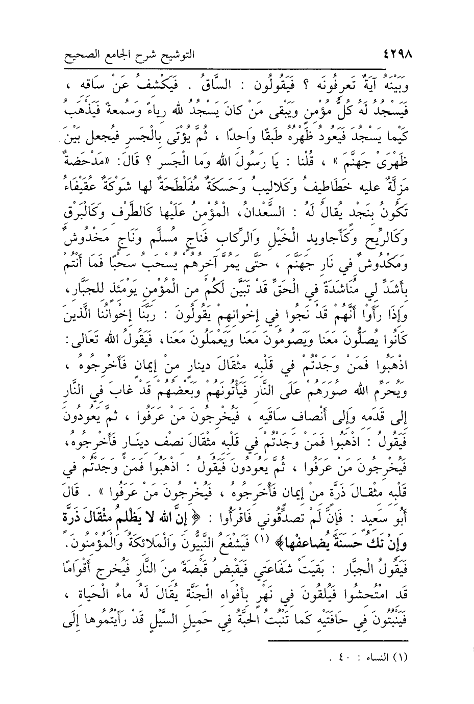وَبَيْنَهُ آيَةٌ تَعْرِفُونَهُ؟ فَيَقُولُونَ: السَّاقُ، فَيَكْشِفُ عَنْ سَاقِهِ، فَيَسْجُدُ لَهُ كُلُّ مُؤْمِنٍ، وَيَبْقَى مَنْ كَانَ يَسْجُدُ لِلَّهِ رِيَاءً وَسُمْعَةً، فَيَذْهَبُ كَيْمَا يَسْجُدَ، فَيَعُودُ ظَهْرُهُ طَبَقًا وَاحِدًا، ثُمَّ يُؤْتَى بِالْجَسْرِ فَيُجْعَلُ بَيْنَ ظَهْرَيْ جَهَنَّمَ "، قُلْنَا: يَا رَسُولَ اللَّهِ، وَمَا الجَسْرُ؟ قَالَ: " مَدْحَضَةٌ مَزِلَّةٌ، عَلَيْهِ خَطَاطِيفُ وَكَلاَلِيبُ، وَحَسَكَةٌ مُفَلْطَحَةٌ لَهَا شَوْكَةٌ عُقَيْفَاءُ، تَكُونُ بِنَجْدٍ، يُقَالُ لَهَا: السَّعْدَانُ، المُؤْمِنُ عَلَيْهَا كَالطَّرْفِ وَكَالْبَرْقِ وَكَالرِّيحِ، وَكَأَجَاوِيدِ الخَيْلِ وَالرِّكَابِ، فَنَاجٍ مُسَلَّمٌ، وَنَاجٍ مَخْدُوشٌ، وَمَكْدُوسٌ فِي نَارِ جَهَنَّمَ، حَتَّى يَمُرَّ آخِرُهُمْ يُسْحَبُ سَحْبًا، فَمَا أَنْتُمْ بِأَشَدَّ لِي مُنَاشَدَةً فِي الحَقِّ، قَدْ تَبَيَّنَ لَكُمْ مِنَ المُؤْمِنِ يَوْمَئِذٍ لِلْجَبَّارِ، وَإِذَا رَأَوْا أَنَّهُمْ قَدْ نَجَوْا، فِي إِخْوَانِهِمْ، يَقُولُونَ: رَبَّنَا إِخْوَانُنَا، كَانُوا يُصَلُّونَ مَعَنَا، وَيَصُومُونَ مَعَنَا، وَيَعْمَلُونَ مَعَنَا، فَيَقُولُ اللَّهُ تَعَالَى: اذْهَبُوا، فَمَنْ وَجَدْتُمْ فِي قَلْبِهِ مِثْقَالَ دِينَارٍ مِنْ إِيمَانٍ فَأَخْرِجُوهُ، وَيُحَرِّمُ اللَّهُ صُوَرَهُمْ عَلَى النَّارِ، فَيَأْتُونَهُمْ وَبَعْضُهُمْ قَدْ غَابَ فِي النَّارِ إِلَى قَدَمِهِ، وَإِلَى أَنْصَافِ سَاقَيْهِ، فَيُخْرِجُونَ مَنْ عَرَفُوا، ثُمَّ يَعُودُونَ، فَيَقُولُ: اذْهَبُوا فَمَنْ وَجَدْتُمْ فِي قَلْبِهِ مِثْقَالَ نِصْفِ دِينَارٍ فَأَخْرِجُوهُ، فَيُخْرِجُونَ مَنْ عَرَفُوا، ثُمَّ يَعُودُونَ، فَيَقُولُ: اذْهَبُوا فَمَنْ وَجَدْتُمْ فِي قَلْبِهِ مِثْقَالَ ذَرَّةٍ مِنْ إِيمَانٍ فَأَخْرِجُوهُ، فَيُخْرِجُونَ مَنْ عَرَفُوا " قَالَ أَبُو سَعِيدٍ: فَإِنْ لَمْ تُصَدِّقُونِي فَاقْرَءُوا: {إِنَّ اللَّهَ لاَ يَظْلِمُ مِثْقَالَ ذَرَّةٍ وَإِنْ تَكُ حَسَنَةً يُضَاعِفْهَا} [النساء: 40]، " فَيَشْفَعُ النَّبِيُّونَ وَالمَلاَئِكَةُ وَالمُؤْمِنُونَ، فَيَقُولُ الجَبَّارُ: بَقِيَتْ شَفَاعَتِي، فَيَقْبِضُ قَبْضَةً مِنَ النَّارِ، فَيُخْرِجُ أَقْوَامًا قَدْ امْتُحِشُوا، فَيُلْقَوْنَ فِي نَهَرٍ بِأَفْوَاهِ الجَنَّةِ، يُقَالُ لَهُ: مَاءُ الحَيَاةِ، فَيَنْبُتُونَ فِي حَافَتَيْهِ كَمَا تَنْبُتُ الحِبَّةُ فِي حَمِيلِ السَّيْلِ، قَدْ رَأَيْتُمُوهَا إِلَى