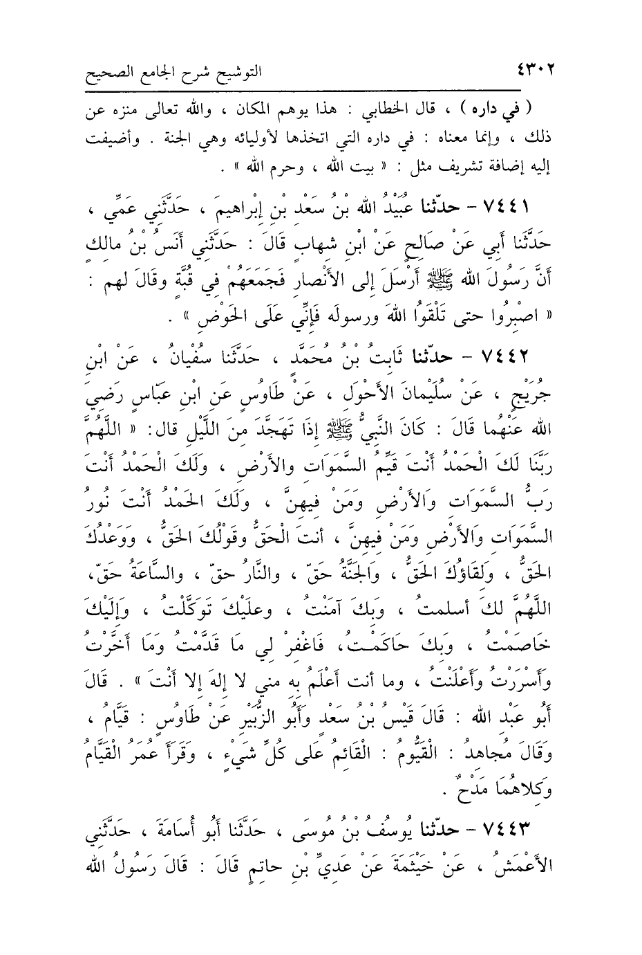 7442 - حَدَّثَنِي ثَابِتُ بْنُ مُحَمَّدٍ، حَدَّثَنَا سُفْيَانُ، عَنِ ابْنِ جُرَيْجٍ، عَنْ سُلَيْمَانَ الأَحْوَلِ، عَنْ طَاوُسٍ، عَنِ ابْنِ عَبَّاسٍ رَضِيَ اللَّهُ عَنْهُمَا، قَالَ: كَانَ النَّبِيُّ صَلَّى اللهُ عَلَيْهِ وَسَلَّمَ إِذَا تَهَجَّدَ مِنَ اللَّيْلِ قَالَ: «اللَّهُمَّ رَبَّنَا لَكَ الحَمْدُ أَنْتَ قَيِّمُ السَّمَوَاتِ وَالأَرْضِ، وَلَكَ الحَمْدُ أَنْتَ رَبُّ السَّمَوَاتِ وَالأَرْضِ وَمَنْ فِيهِنَّ، وَلَكَ الحَمْدُ أَنْتَ نُورُ السَّمَوَاتِ وَالأَرْضِ وَمَنْ فِيهِنَّ، أَنْتَ الحَقُّ، وَقَوْلُكَ الحَقُّ، وَوَعْدُكَ الحَقُّ، وَلِقَاؤُكَ الحَقُّ، وَالجَنَّةُ حَقٌّ، وَالنَّارُ حَقٌّ، وَالسَّاعَةُ حَقٌّ، اللَّهُمَّ لَكَ أَسْلَمْتُ، وَبِكَ آمَنْتُ، وَعَلَيْكَ تَوَكَّلْتُ، وَإِلَيْكَ خَاصَمْتُ، وَبِكَ حَاكَمْتُ، فَاغْفِرْ لِي مَا قَدَّمْتُ وَمَا أَخَّرْتُ، وَأَسْرَرْتُ وَأَعْلَنْتُ، وَمَا أَنْتَ أَعْلَمُ بِهِ مِنِّي، لاَ إِلَهَ إِلَّا أَنْتَ»، قَالَ أَبُو عَبْدِ اللَّهِ: قَالَ قَيْسُ بْنُ سَعْدٍ، وَأَبُو الزُّبَيْرِ، عَنْ طَاوُسٍ، «قَيَّامُ»، وَقَالَ مُجَاهِدٌ: «القَيُّومُ القَائِمُ عَلَى كُلِّ شَيْءٍ»، وَقَرَأَ عُمَرُ، القَيَّامُ، «وَكِلاَهُمَا مَدْحٌ».