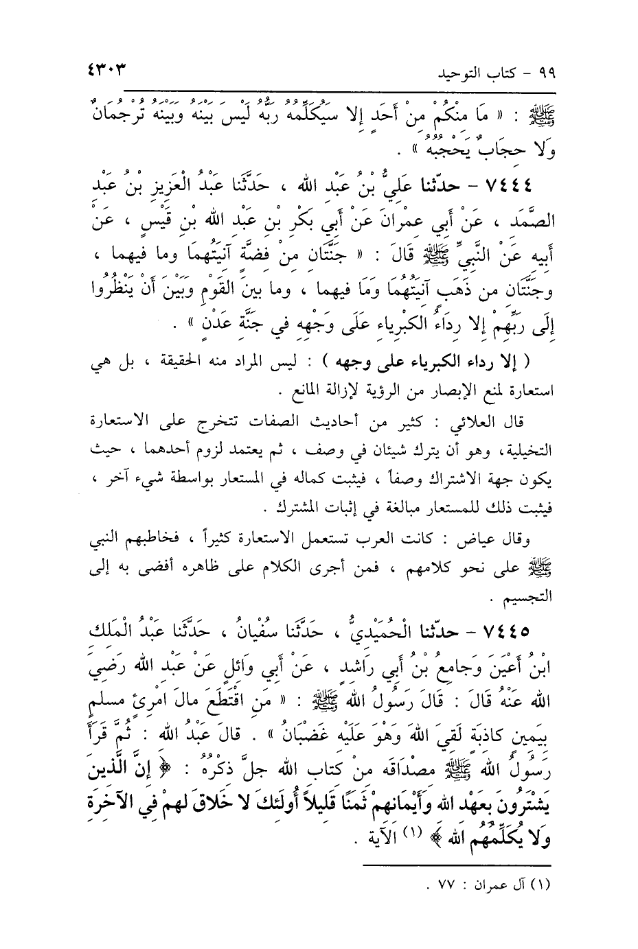 7444 - حَدَّثَنَا عَلِيُّ بْنُ عَبْدِ اللَّهِ، حَدَّثَنَا عَبْدُ العَزِيزِ بْنُ عَبْدِ الصَّمَدِ، عَنْ أَبِي عِمْرَانَ، عَنْ أَبِي بَكْرِ بْنِ عَبْدِ اللَّهِ بْنِ قَيْسٍ، عَنْ أَبِيهِ، عَنِ النَّبِيِّ صَلَّى اللهُ عَلَيْهِ وَسَلَّمَ قَالَ: «جَنَّتَانِ مِنْ فِضَّةٍ، آنِيَتُهُمَا وَمَا فِيهِمَا، وَجَنَّتَانِ مِنْ ذَهَبٍ، آنِيَتُهُمَا وَمَا فِيهِمَا، وَمَا بَيْنَ القَوْمِ وَبَيْنَ أَنْ يَنْظُرُوا إِلَى رَبِّهِمْ إِلَّا رِدَاءُ الكِبْرِ عَلَى وَجْهِهِ فِي جَنَّةِ عَدْنٍ».