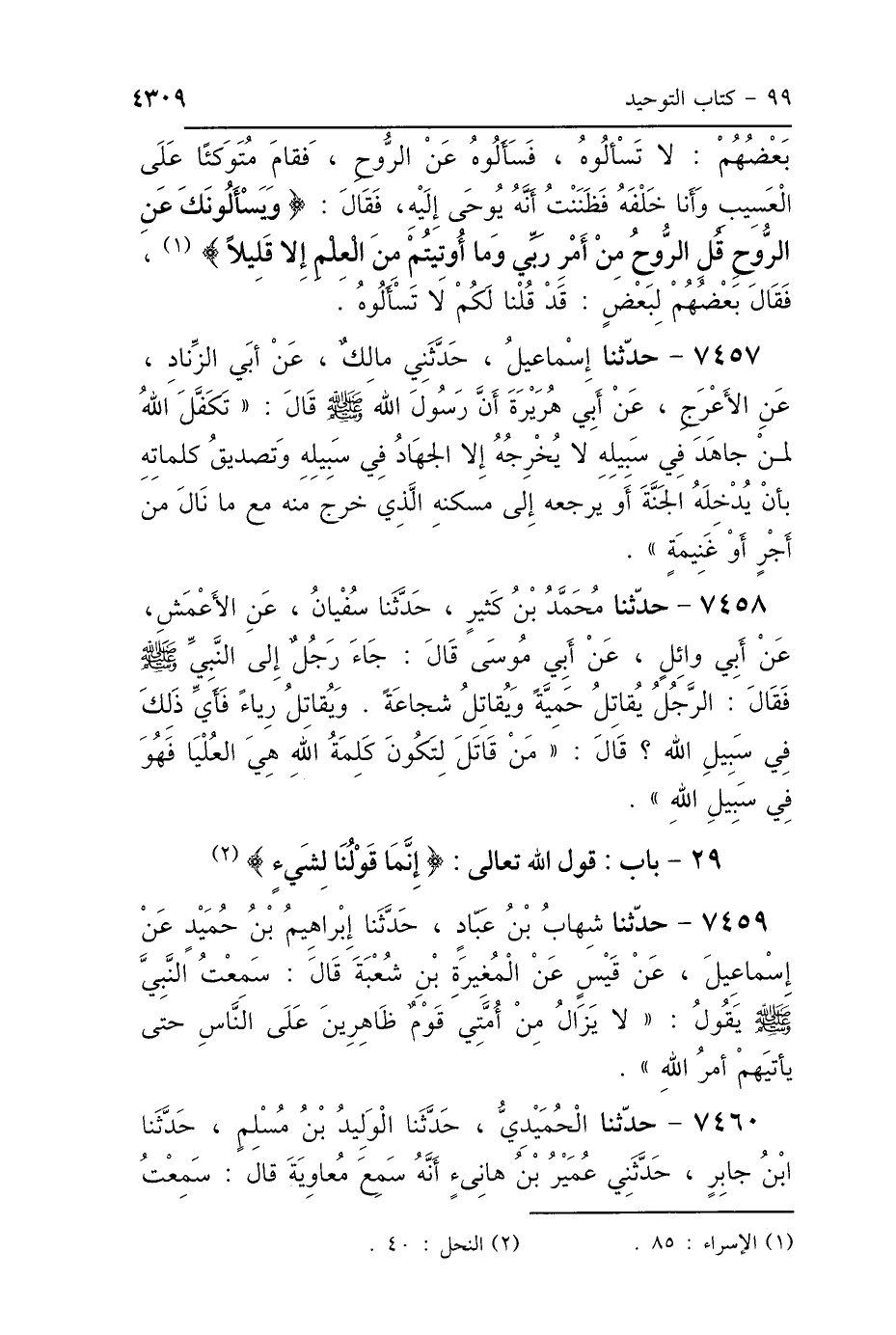 7458 - حَدَّثَنَا مُحَمَّدُ بْنُ كَثِيرٍ، حَدَّثَنَا سُفْيَانُ، عَنِ الأَعْمَشِ، عَنْ أَبِي وَائِلٍ، عَنْ أَبِي مُوسَى، قَالَ: جَاءَ رَجُلٌ إِلَى النَّبِيِّ صَلَّى اللهُ عَلَيْهِ وَسَلَّمَ فَقَالَ الرَّجُلُ: يُقَاتِلُ حَمِيَّةً، وَيُقَاتِلُ شَجَاعَةً، وَيُقَاتِلُ رِيَاءً، فَأَيُّ ذَلِكَ فِي سَبِيلِ اللَّهِ؟ قَالَ: «مَنْ قَاتَلَ لِتَكُونَ كَلِمَةُ اللَّهِ هِيَ العُلْيَا، فَهُوَ فِي سَبِيلِ اللَّهِ».