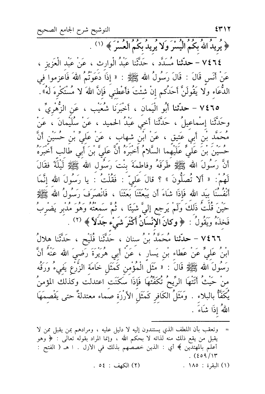 7465 - حَدَّثَنَا أَبُو اليَمَانِ، أَخْبَرَنَا شُعَيْبٌ، عَنِ الزُّهْرِيِّ، ح وحَدَّثَنَا إِسْمَاعِيلُ، حَدَّثَنِي أَخِي عَبْدُ الحَمِيدِ، عَنْ سُلَيْمَانَ، عَنْ مُحَمَّدِ بْنِ أَبِي عَتِيقٍ، عَنِ ابْنِ شِهَابٍ، عَنْ عَلِيِّ بْنِ حُسَيْنٍ، أَنَّ حُسَيْنَ بْنَ عَلِيٍّ، عَلَيْهِمَا السَّلاَمُ أَخْبَرَهُ: أَنَّ عَلِيَّ بْنَ أَبِي طَالِبٍ، أَخْبَرَهُ أَنَّ رَسُولَ اللَّهِ صَلَّى اللهُ عَلَيْهِ وَسَلَّمَ طَرَقَهُ وَفَاطِمَةَ بِنْتَ رَسُولِ اللَّهِ صَلَّى اللهُ عَلَيْهِ وَسَلَّمَ لَيْلَةً، فَقَالَ لَهُمْ: «أَلاَ تُصَلُّونَ»، قَالَ عَلِيٌّ: فَقُلْتُ: يَا رَسُولَ اللَّهِ، إِنَّمَا أَنْفُسُنَا بِيَدِ اللَّهِ، فَإِذَا شَاءَ أَنْ يَبْعَثَنَا بَعَثَنَا، فَانْصَرَفَ رَسُولُ اللَّهِ صَلَّى اللهُ عَلَيْهِ وَسَلَّمَ حِينَ قُلْتُ ذَلِكَ، وَلَمْ يَرْجِعْ إِلَيَّ شَيْئًا، ثُمَّ سَمِعْتُهُ وَهُوَ مُدْبِرٌ يَضْرِبُ فَخِذَهُ وَيَقُولُ: {وَكَانَ الإِنْسَانُ أَكْثَرَ شَيْءٍ جَدَلًا} [الكهف: 54].
