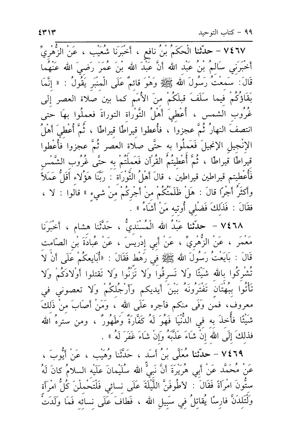 7468 - حَدَّثَنَا عَبْدُ اللَّهِ المُسْنَدِيُّ، حَدَّثَنَا هِشَامٌ، أَخْبَرَنَا مَعْمَرٌ، عَنِ الزُّهْرِيِّ، عَنْ أَبِي إِدْرِيسَ، عَنْ عُبَادَةَ بْنِ الصَّامِتِ، قَالَ: بَايَعْتُ رَسُولَ اللَّهِ صَلَّى اللهُ عَلَيْهِ وَسَلَّمَ فِي رَهْطٍ، فَقَالَ: " أُبَايِعُكُمْ عَلَى أَنْ لاَ تُشْرِكُوا بِاللَّهِ شَيْئًا، وَلاَ تَسْرِقُوا، وَلاَ تَزْنُوا، وَلاَ تَقْتُلُوا أَوْلاَدَكُمْ، وَلاَ تَأْتُوا بِبُهْتَانٍ تَفْتَرُونَهُ بَيْنَ أَيْدِيكُمْ وَأَرْجُلِكُمْ، وَلاَ تَعْصُونِي فِي مَعْرُوفٍ، فَمَنْ وَفَى مِنْكُمْ فَأَجْرُهُ عَلَى اللَّهِ، وَمَنْ أَصَابَ مِنْ ذَلِكَ شَيْئًا فَأُخِذَ بِهِ فِي الدُّنْيَا، فَهُوَ لَهُ كَفَّارَةٌ وَطَهُورٌ، وَمَنْ سَتَرَهُ اللَّهُ، فَذَلِكَ إِلَى اللَّهِ: إِنْ شَاءَ عَذَّبَهُ، وَإِنْ شَاءَ غَفَرَ لَهُ".