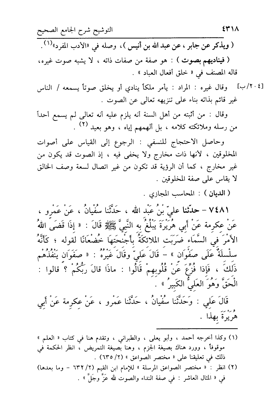 (فيناديهم بصوت): هو صفة من صفات ذاته، لا يشبه صوت غيره، قاله الصنف في "خلق أفعال العباد".