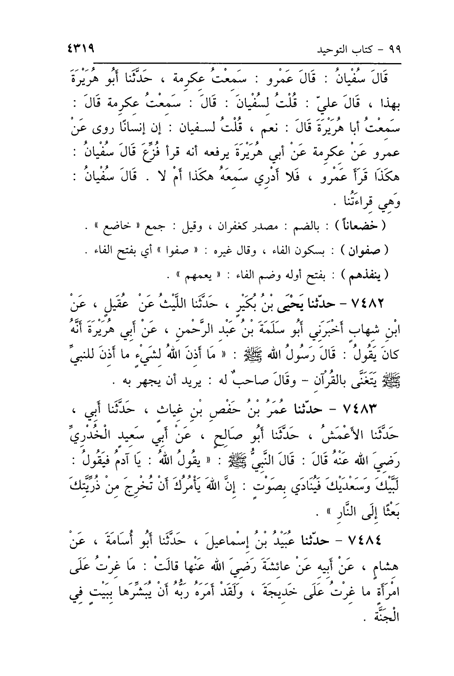 7483 - حَدَّثَنَا عُمَرُ بْنُ حَفْصِ بْنِ غِيَاثٍ، حَدَّثَنَا أَبِي، حَدَّثَنَا الأَعْمَشُ، حَدَّثَنَا أَبُو صَالِحٍ، عَنْ أَبِي سَعِيدٍ الخُدْرِيِّ رَضِيَ اللَّهُ عَنْهُ، قَالَ: قَالَ النَّبِيُّ صَلَّى اللهُ عَلَيْهِ وَسَلَّمَ: " يَقُولُ اللَّهُ: يَا آدَمُ، فَيَقُولُ: لَبَّيْكَ وَسَعْدَيْكَ، فَيُنَادَى بِصَوْتٍ إِنَّ اللَّهَ يَأْمُرُكَ أَنْ تُخْرِجَ مِنْ ذُرِّيَّتِكَ بَعْثًا إِلَى النَّارِ".