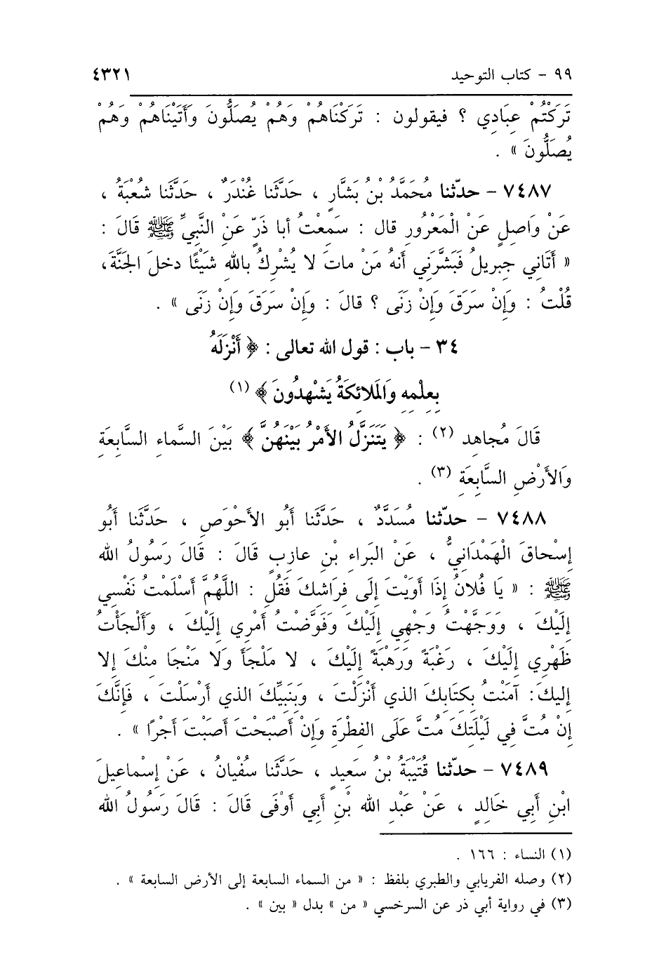 7488 - حَدَّثَنَا مُسَدَّدٌ، حَدَّثَنَا أَبُو الأَحْوَصِ، حَدَّثَنَا أَبُو إِسْحَاقَ الهَمْدَانِيُّ، عَنِ البَرَاءِ بْنِ عَازِبٍ، قَالَ: قَالَ رَسُولُ اللَّهِ صَلَّى اللهُ عَلَيْهِ وَسَلَّمَ: "يَا فُلاَنُ إِذَا أَوَيْتَ إِلَى فِرَاشِكَ فَقُلْ: اللَّهُمَّ أَسْلَمْتُ نَفْسِي إِلَيْكَ، وَوَجَّهْتُ وَجْهِي إِلَيْكَ، وَفَوَّضْتُ أَمْرِي إِلَيْكَ، وَأَلْجَأْتُ ظَهْرِي إِلَيْكَ، رَغْبَةً وَرَهْبَةً إِلَيْكَ، لاَ مَلْجَأَ وَلاَ مَنْجَا مِنْكَ إِلَّا إِلَيْكَ، آمَنْتُ بِكِتَابِكَ الَّذِي أَنْزَلْتَ، وَبِنَبِيِّكَ الَّذِي أَرْسَلْتَ، فَإِنَّكَ إِنْ مُتَّ فِي لَيْلَتِكَ مُتَّ عَلَى الفِطْرَةِ، وَإِنْ أَصْبَحْتَ أَصَبْتَ أَجْرًا".
