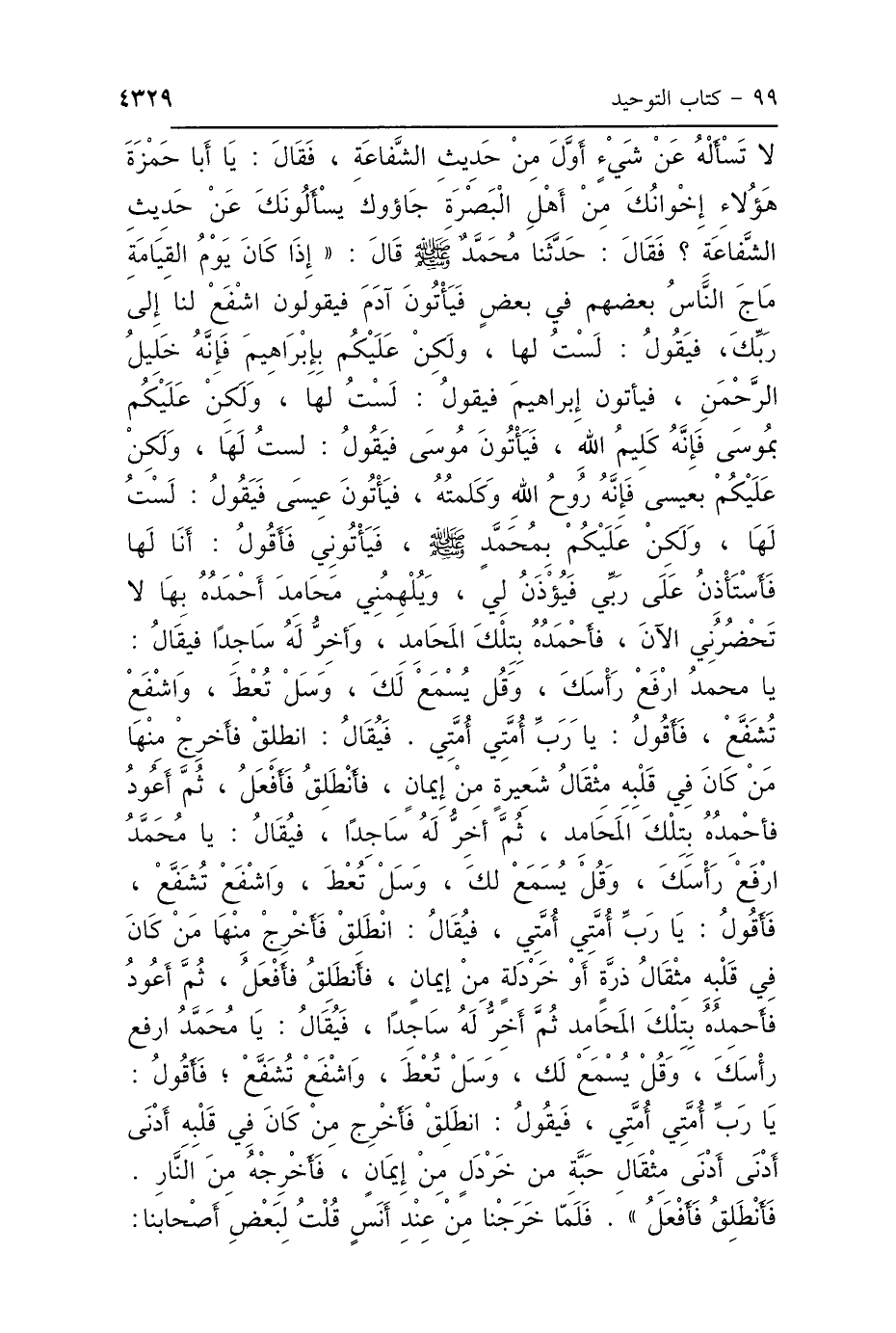 لاَ تَسْأَلْهُ عَنْ شَيْءٍ أَوَّلَ مِنْ حَدِيثِ الشَّفَاعَةِ، فَقَالَ: يَا أَبَا حَمْزَةَ هَؤُلاَءِ إِخْوَانُكَ مِنْ أَهْلِ البَصْرَةِ جَاءُوكَ يَسْأَلُونَكَ عَنْ حَدِيثِ الشَّفَاعَةِ، فَقَالَ: حَدَّثَنَا مُحَمَّدٌ صَلَّى اللهُ عَلَيْهِ وَسَلَّمَ قَالَ: " إِذَا كَانَ يَوْمُ القِيَامَةِ مَاجَ النَّاسُ بَعْضُهُمْ فِي بَعْضٍ، فَيَأْتُونَ آدَمَ، فَيَقُولُونَ: اشْفَعْ لَنَا إِلَى رَبِّكَ، فَيَقُولُ: لَسْتُ لَهَا، وَلَكِنْ عَلَيْكُمْ بِإِبْرَاهِيمَ فَإِنَّهُ خَلِيلُ الرَّحْمَنِ، فَيَأْتُونَ إِبْرَاهِيمَ، فَيَقُولُ: لَسْتُ لَهَا، وَلَكِنْ عَلَيْكُمْ بِمُوسَى فَإِنَّهُ كَلِيمُ اللَّهِ، فَيَأْتُونَ مُوسَى فَيَقُولُ: لَسْتُ لَهَا، وَلَكِنْ عَلَيْكُمْ بِعِيسَى فَإِنَّهُ رُوحُ اللَّهِ، وَكَلِمَتُهُ، فَيَأْتُونَ عِيسَى، فَيَقُولُ: لَسْتُ لَهَا، وَلَكِنْ عَلَيْكُمْ بِمُحَمَّدٍ صَلَّى اللهُ عَلَيْهِ وَسَلَّمَ، فَيَأْتُونِي، فَأَقُولُ: أَنَا لَهَا، فَأَسْتَأْذِنُ عَلَى رَبِّي، فَيُؤْذَنُ لِي، وَيُلْهِمُنِي مَحَامِدَ أَحْمَدُهُ بِهَا لاَ تَحْضُرُنِي الآنَ، فَأَحْمَدُهُ بِتِلْكَ المَحَامِدِ، وَأَخِرُّ لَهُ سَاجِدًا، فَيَقُولُ: يَا مُحَمَّدُ ارْفَعْ رَأْسَكَ، وَقُلْ يُسْمَعْ لَكَ، وَسَلْ تُعْطَ، وَاشْفَعْ تُشَفَّعْ، فَأَقُولُ: يَا رَبِّ، أُمَّتِي أُمَّتِي، فَيَقُولُ: انْطَلِقْ فَأَخْرِجْ مِنْهَا مَنْ كَانَ فِي قَلْبِهِ مِثْقَالُ شَعِيرَةٍ مِنْ إِيمَانٍ، فَأَنْطَلِقُ فَأَفْعَلُ، ثُمَّ أَعُودُ، فَأَحْمَدُهُ بِتِلْكَ المَحَامِدِ، ثُمَّ أَخِرُّ لَهُ سَاجِدًا، فَيُقَالُ: يَا مُحَمَّدُ ارْفَعْ رَأْسَكَ، وَقُلْ يُسْمَعْ لَكَ، وَسَلْ تُعْطَ، وَاشْفَعْ تُشَفَّعْ، فَأَقُولُ: يَا رَبِّ، أُمَّتِي أُمَّتِي، فَيَقُولُ: انْطَلِقْ فَأَخْرِجْ مِنْهَا مَنْ كَانَ فِي قَلْبِهِ مِثْقَالُ ذَرَّةٍ - أَوْ خَرْدَلَةٍ - مِنْ إِيمَانٍ فَأَخْرِجْهُ، فَأَنْطَلِقُ، فَأَفْعَلُ، ثُمَّ أَعُودُ فَأَحْمَدُهُ بِتِلْكَ المَحَامِدِ، ثُمَّ أَخِرُّ لَهُ سَاجِدًا، فَيَقُولُ: يَا مُحَمَّدُ ارْفَعْ رَأْسَكَ، وَقُلْ يُسْمَعْ لَكَ، وَسَلْ تُعْطَ، وَاشْفَعْ تُشَفَّعْ، فَأَقُولُ: يَا رَبِّ أُمَّتِي أُمَّتِي، فَيَقُولُ: انْطَلِقْ فَأَخْرِجْ مَنْ كَانَ فِي قَلْبِهِ أَدْنَى أَدْنَى أَدْنَى مِثْقَالِ حَبَّةِ خَرْدَلٍ مِنْ إِيمَانٍ، فَأَخْرِجْهُ مِنَ النَّارِ، فَأَنْطَلِقُ فَأَفْعَلُ " فَلَمَّا خَرَجْنَا مِنْ عِنْدِ أَنَسٍ قُلْتُ لِبَعْضِ أَصْحَابِنَا: