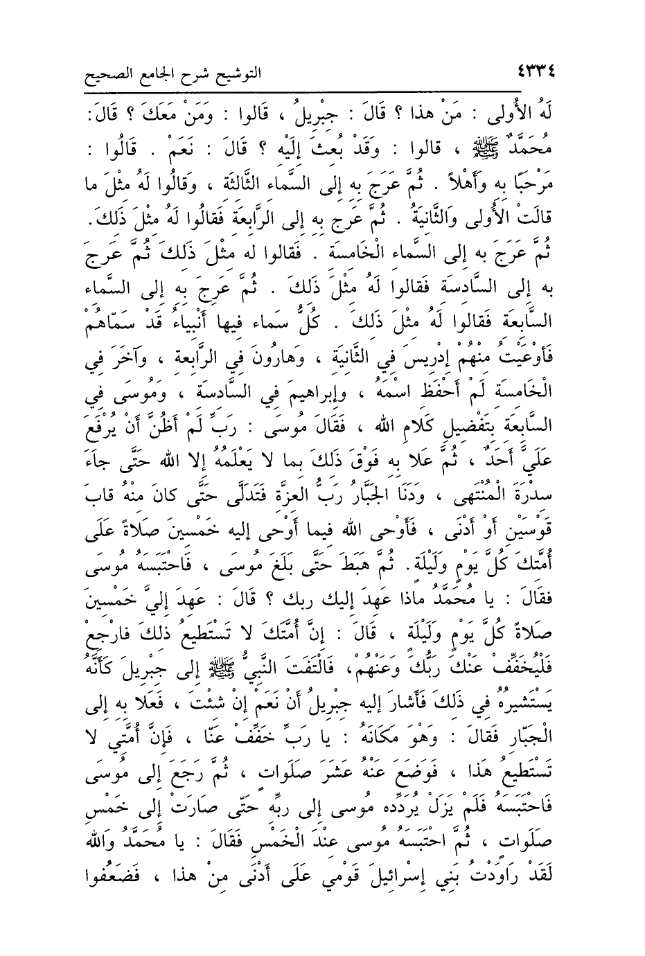 لَهُ الأُولَى مَنْ هَذَا، قَالَ جِبْرِيلُ: قَالُوا: وَمَنْ مَعَكَ؟ قَالَ: مُحَمَّدٌ صَلَّى اللهُ عَلَيْهِ وَسَلَّمَ، قَالُوا: وَقَدْ بُعِثَ إِلَيْهِ؟ قَالَ: نَعَمْ، قَالُوا: مَرْحَبًا بِهِ وَأَهْلًا، ثُمَّ عَرَجَ بِهِ إِلَى السَّمَاءِ الثَّالِثَةِ، وَقَالُوا لَهُ مِثْلَ مَا قَالَتِ الأُولَى وَالثَّانِيَةُ، ثُمَّ عَرَجَ بِهِ إِلَى الرَّابِعَةِ، فَقَالُوا لَهُ مِثْلَ ذَلِكَ، ثُمَّ عَرَجَ بِهِ إِلَى السَّمَاءِ الخَامِسَةِ، فَقَالُوا مِثْلَ ذَلِكَ، ثُمَّ عَرَجَ بِهِ إِلَى السَّمَاءِ السَّادِسَةِ، فَقَالُوا لَهُ مِثْلَ ذَلِكَ، ثُمَّ عَرَجَ بِهِ إِلَى السَّمَاءِ السَّابِعَةِ، فَقَالُوا لَهُ مِثْلَ ذَلِكَ، كُلُّ سَمَاءٍ فِيهَا أَنْبِيَاءُ قَدْ سَمَّاهُمْ، فَأَوْعَيْتُ مِنْهُمْ إِدْرِيسَ فِي الثَّانِيَةِ، وَهَارُونَ فِي الرَّابِعَةِ، وَآخَرَ فِي الخَامِسَةِ لَمْ أَحْفَظِ اسْمَهُ، وَإِبْرَاهِيمَ فِي السَّادِسَةِ، وَمُوسَى فِي السَّابِعَةِ بِتَفْضِيلِ كَلاَمِ اللَّهِ، فَقَالَ مُوسَى: رَبِّ لَمْ أَظُنَّ أَنْ يُرْفَعَ عَلَيَّ أَحَدٌ، ثُمَّ عَلاَ بِهِ فَوْقَ ذَلِكَ بِمَا لاَ يَعْلَمُهُ إِلَّا اللَّهُ، حَتَّى جَاءَ سِدْرَةَ المُنْتَهَى، وَدَنَا لِلْجَبَّارِ رَبِّ العِزَّةِ، فَتَدَلَّى حَتَّى كَانَ مِنْهُ قَابَ قَوْسَيْنِ أَوْ أَدْنَى، فَأَوْحَى اللَّهُ فِيمَا أَوْحَى إِلَيْهِ: خَمْسِينَ صَلاَةً عَلَى أُمَّتِكَ كُلَّ يَوْمٍ وَلَيْلَةٍ، ثُمَّ هَبَطَ حَتَّى بَلَغَ مُوسَى، فَاحْتَبَسَهُ مُوسَى، فَقَالَ: يَا مُحَمَّدُ، مَاذَا عَهِدَ إِلَيْكَ رَبُّكَ؟ قَالَ: عَهِدَ إِلَيَّ خَمْسِينَ صَلاَةً كُلَّ يَوْمٍ وَلَيْلَةٍ، قَالَ: إِنَّ أُمَّتَكَ لاَ تَسْتَطِيعُ ذَلِكَ، فَارْجِعْ فَلْيُخَفِّفْ عَنْكَ رَبُّكَ وَعَنْهُمْ، فَالْتَفَتَ النَّبِيُّ صَلَّى اللهُ عَلَيْهِ وَسَلَّمَ إِلَى جِبْرِيلَ كَأَنَّهُ يَسْتَشِيرُهُ فِي ذَلِكَ، فَأَشَارَ إِلَيْهِ جِبْرِيلُ: أَنْ نَعَمْ إِنْ شِئْتَ، فَعَلاَ بِهِ إِلَى الجَبَّارِ، فَقَالَ وَهُوَ مَكَانَهُ: يَا رَبِّ خَفِّفْ عَنَّا فَإِنَّ أُمَّتِي لاَ تَسْتَطِيعُ هَذَا، فَوَضَعَ عَنْهُ عَشْرَ صَلَوَاتٍ ثُمَّ رَجَعَ إِلَى مُوسَى، فَاحْتَبَسَهُ فَلَمْ يَزَلْ يُرَدِّدُهُ مُوسَى إِلَى رَبِّهِ حَتَّى صَارَتْ إِلَى خَمْسِ صَلَوَاتٍ، ثُمَّ احْتَبَسَهُ مُوسَى عِنْدَ الخَمْسِ، فَقَالَ: يَا مُحَمَّدُ وَاللَّهِ لَقَدْ رَاوَدْتُ بَنِي إِسْرَائِيلَ قَوْمِي عَلَى أَدْنَى مِنْ هَذَا فَضَعُفُوا