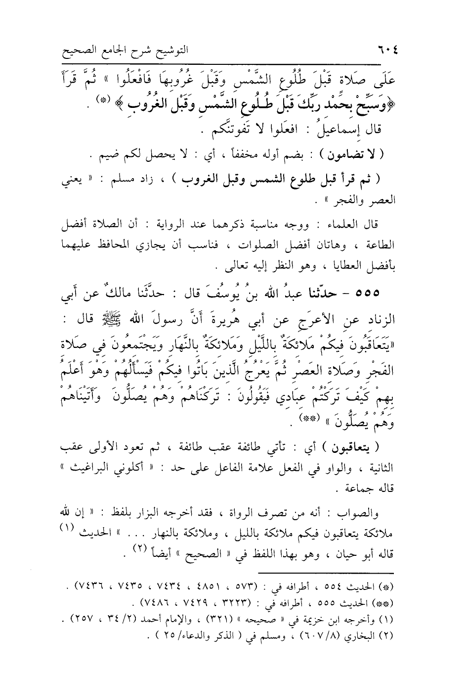 555 - حَدَّثَنَا عَبْدُ اللَّهِ بْنُ يُوسُفَ، قَالَ: حَدَّثَنَا مَالِكٌ، عَنْ أَبِي الزِّنَادِ، عَنِ الأَعْرَجِ، عَنْ أَبِي هُرَيْرَةَ: أَنَّ رَسُولَ اللَّهِ صَلَّى اللهُ عَلَيْهِ وَسَلَّمَ قَالَ: "يَتَعَاقَبُونَ فِيكُمْ مَلاَئِكَةٌ بِاللَّيْلِ وَمَلاَئِكَةٌ بِالنَّهَارِ، وَيَجْتَمِعُونَ فِي صَلاَةِ الفَجْرِ وَصَلاَةِ العَصْرِ، ثُمَّ يَعْرُجُ الَّذِينَ بَاتُوا فِيكُمْ، فَيَسْأَلُهُمْ وَهُوَ أَعْلَمُ بِهِمْ: كَيْفَ تَرَكْتُمْ عِبَادِي؟ فَيَقُولُونَ: تَرَكْنَاهُمْ وَهُمْ يُصَلُّونَ، وَأَتَيْنَاهُمْ وَهُمْ يُصَلُّونَ".