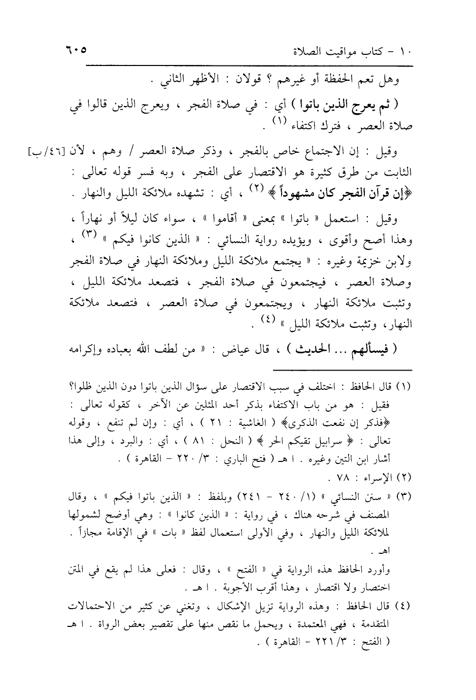 وقيل: استعمل "باتوا" بمعنى "أقاموا"، سواء كان ليلًا أو نهارًا، وهذا أصح وأقوى، ويؤيده رواية النسائي: "الذين كانوا فيكم"، ولابن خزيمة وغيره: "يجتمع ملائكة الليل وملائكة النهار في صلاة الفجر وصلاة العصر، فيجتمعون في صلاة الفجر، فتصعد ملائكة الليل، وتثبت ملائكة النهار، ويجتمعون في صلاة العصر، فتصعد ملائكة النهار، وتثبت ملائكة الليل".