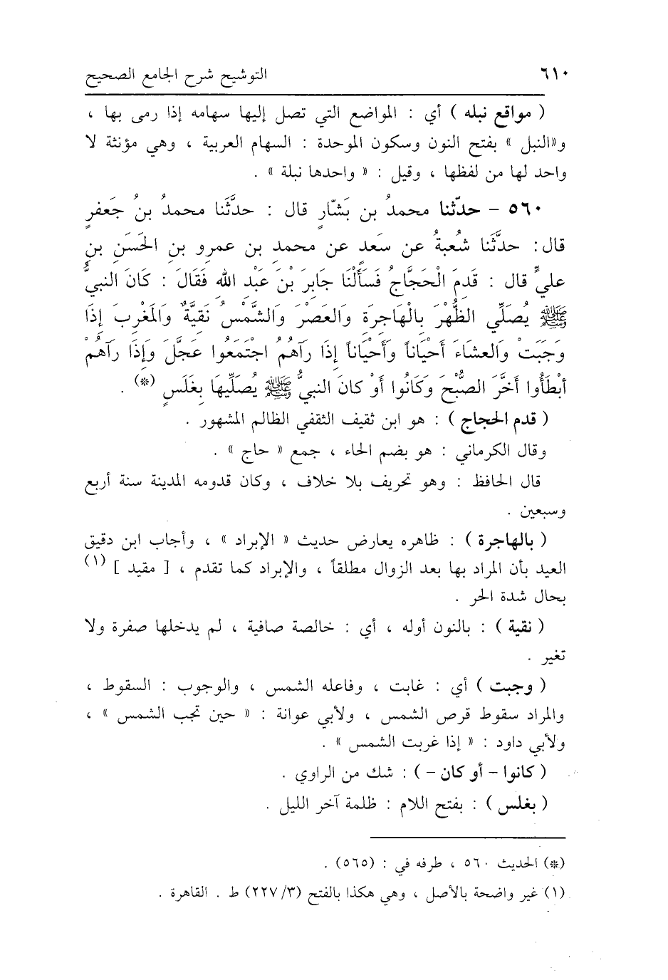 560 - حَدَّثَنَا مُحَمَّدُ بْنُ بَشَّارٍ، قَالَ: حَدَّثَنَا مُحَمَّدُ بْنُ جَعْفَرٍ، قَالَ: حَدَّثَنَا شُعْبَةُ، عَنْ سَعْدِ بْنِ إِبْرَاهِيمَ، عَنْ مُحَمَّدِ بْنِ عَمْرِو بْنِ الحَسَنِ بْنِ عَلِيٍّ، قَالَ: قَدِمَ الحَجَّاجُ فَسَأَلْنَا جَابِرَ بْنَ عَبْدِ اللَّهِ، فَقَالَ: «كَانَ النَّبِيُّ صَلَّى اللهُ عَلَيْهِ وَسَلَّمَ يُصَلِّي الظُّهْرَ بِالهَاجِرَةِ، وَالعَصْرَ وَالشَّمْسُ نَقِيَّةٌ، وَالمَغْرِبَ إِذَا وَجَبَتْ، وَالعِشَاءَ أَحْيَانًا وَأَحْيَانًا، إِذَا رَآهُمُ اجْتَمَعُوا عَجَّلَ، وَإِذَا رَآهُمْ أَبْطَؤُوا أَخَّرَ، وَالصُّبْحَ كَانُوا - أَوْ كَانَ - النَّبِيُّ صَلَّى اللهُ عَلَيْهِ وَسَلَّمَ يُصَلِّيهَا بِغَلَسٍ».