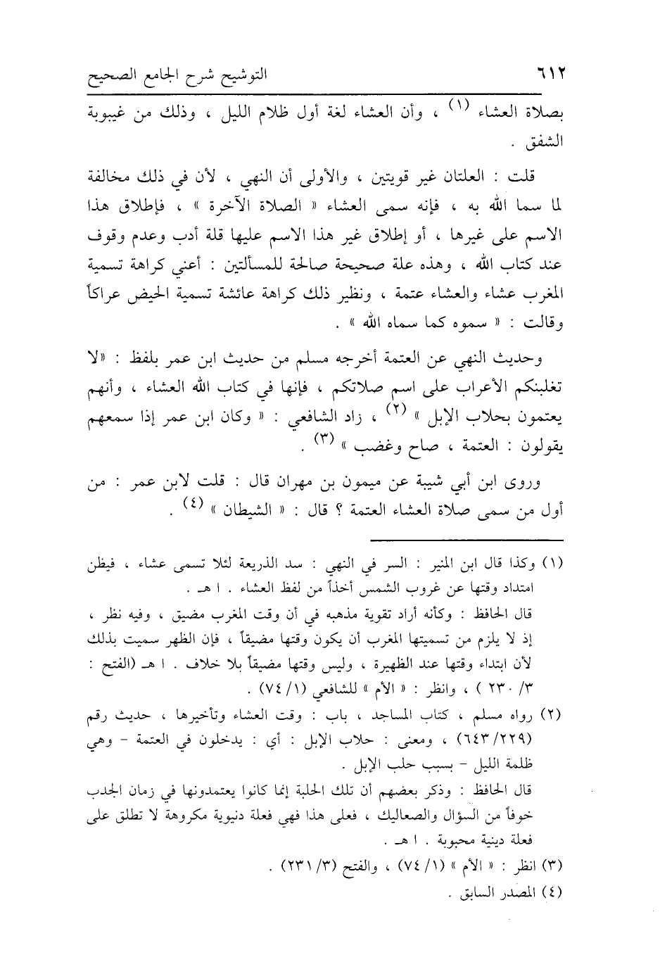وحديث النهي عن العتمة أخرجه مسلم من حديث ابن عمر بلفظ: "لا تغلبنكم الأعراب على اسم صلاتكم، فإنها في كتاب الله العشاء، وأنهم يعتمون بحلاب الإبل"، زاد الشافعي: "وكان ابن عمر إذا سمعهم يقولون: العتمة، صاح وغضب".