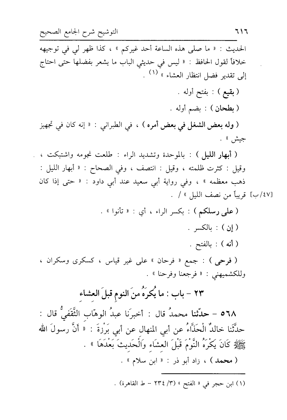الحديث: "ما صلى هذه الساعة أحد غيركم"، كذا ظهر لي في توجيهه خلافًا لقول الحافظ: "ليس في حديثي الباب ما يشعر بفضلها حتى احتاج إلى تقدير فضل انتظار العشاء".