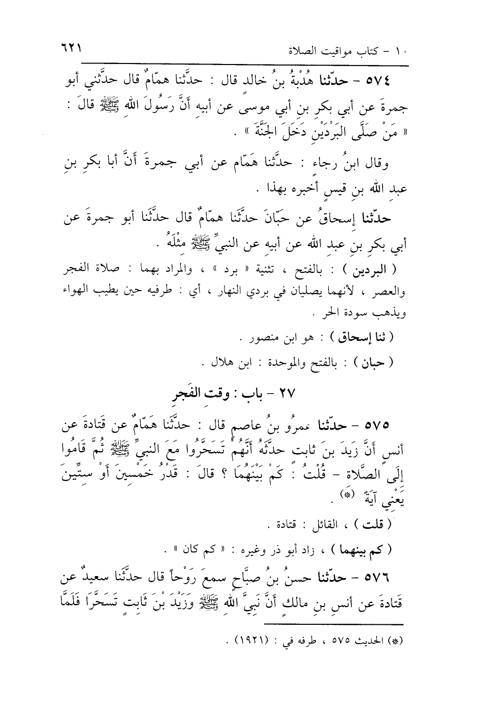 574 - حَدَّثَنَا هُدْبَةُ بْنُ خَالِدٍ، قَالَ: حَدَّثَنَا هَمَّامٌ، حَدَّثَنِي أَبُو جَمْرَةَ، عَنْ أَبِي بَكْرِ بْنِ أَبِي مُوسَى، عَنْ أَبِيهِ، أَنَّ رَسُولَ اللَّهِ صَلَّى اللهُ عَلَيْهِ وَسَلَّمَ قَالَ: «مَنْ صَلَّى البَرْدَيْنِ دَخَلَ الجَنَّةَ».