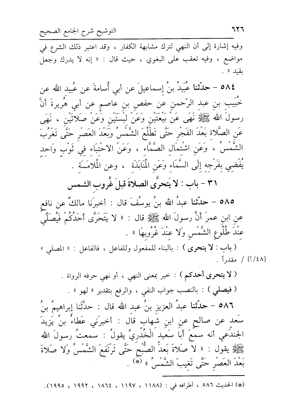 585 - حَدَّثَنَا عَبْدُ اللَّهِ بْنُ يُوسُفَ، قَالَ: أَخْبَرَنَا مَالِكٌ، عَنْ نَافِعٍ، عَنِ ابْنِ عُمَرَ: أَنَّ رَسُولَ اللَّهِ صَلَّى اللهُ عَلَيْهِ وَسَلَّمَ قَالَ: «لاَ يَتَحَرَّى أَحَدُكُمْ، فَيُصَلِّي عِنْدَ طُلُوعِ الشَّمْسِ وَلاَ عِنْدَ غُرُوبِهَا».