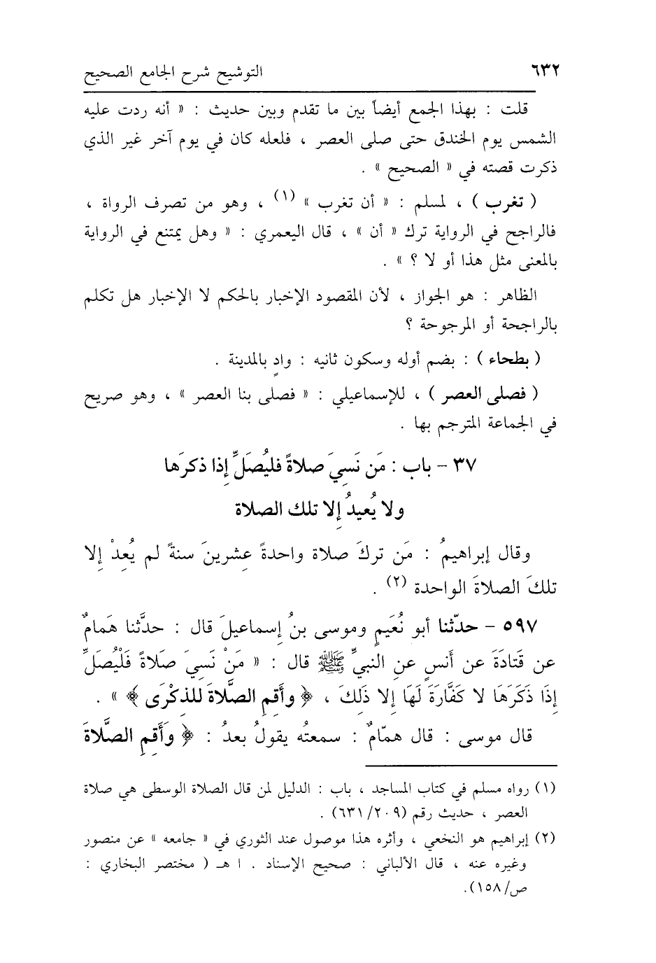 قلت: بهذا الجمع أيضًا بين ما تقدم وبين حديث: "أنه ردت عليه الشمس يوم الخندق حتى صلى العصر، فلعله كان في يوم آخر غير الذي ذكرت قصته في "الصحيح".