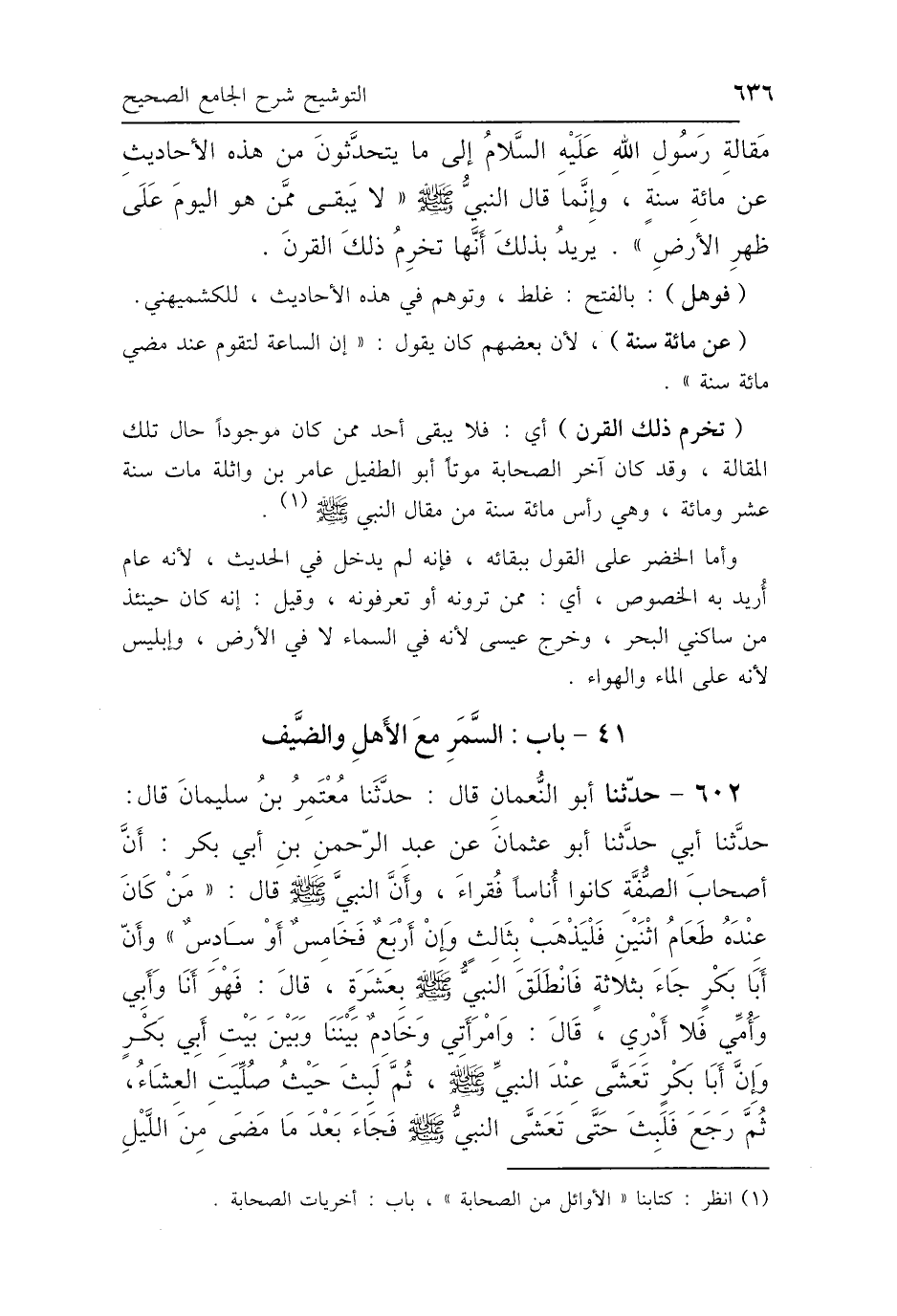 مَقَالَةِ رَسُولِ اللَّهِ صَلَّى اللهُ عَلَيْهِ وَسَلَّمَ، إِلَى مَا يَتَحَدَّثُونَ مِنْ هَذِهِ الأَحَادِيثِ، عَنْ مِائَةِ سَنَةٍ، وَإِنَّمَا قَالَ النَّبِيُّ صَلَّى اللهُ عَلَيْهِ وَسَلَّمَ: «لاَ يَبْقَى مِمَّنْ هُوَ اليَوْمَ عَلَى ظَهْرِ الأَرْضِ» يُرِيدُ بِذَلِكَ أَنَّهَا تَخْرِمُ ذَلِكَ القَرْنَ.