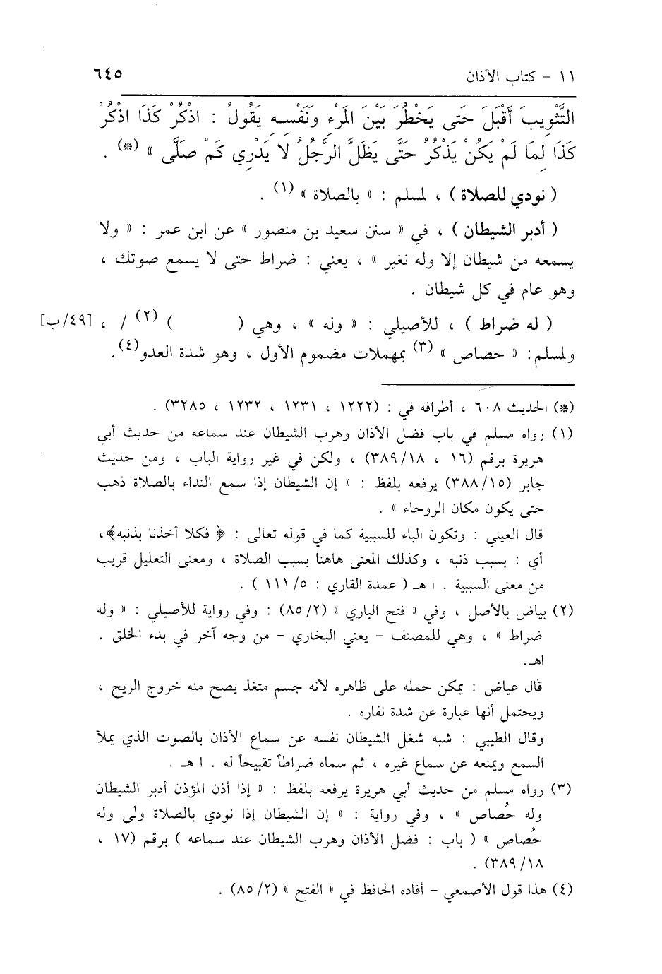 (أدبر الشيطان)، في "سنن سعيد بن منصور" عن ابن عمر: "ولا يسمعه من شيطان إلا وله نغير"، يعني: ضراط حتى لا يسمع صوتك، وهو عام في كل شيطان.