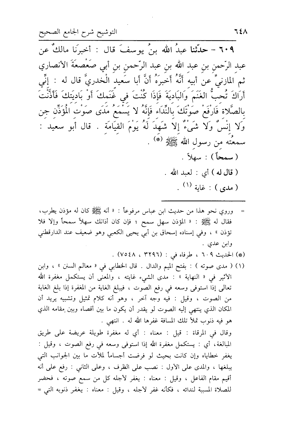 609 - حَدَّثَنَا عَبْدُ اللَّهِ بْنُ يُوسُفَ، قَالَ: أَخْبَرَنَا مَالِكٌ، عَنْ عَبْدِ الرَّحْمَنِ بْنِ عَبْدِ اللَّهِ بْنِ عَبْدِ الرَّحْمَنِ بْنِ أَبِي صَعْصَعَةَ الأَنْصَارِيِّ ثُمَّ المَازِنِيِّ، عَنْ أَبِيهِ، أَنَّهُ أَخْبَرَهُ أَنَّ أَبَا سَعِيدٍ الخُدْرِيَّ، قَالَ لَهُ: إِنِّي أَرَاكَ تُحِبُّ الغَنَمَ وَالبَادِيَةَ، فَإِذَا كُنْتَ فِي غَنَمِكَ، أَوْ بَادِيَتِكَ، فَأَذَّنْتَ بِالصَّلاَةِ فَارْفَعْ صَوْتَكَ بِالنِّدَاءِ، فَإِنَّهُ: «لاَ يَسْمَعُ مَدَى صَوْتِ المُؤَذِّنِ، جِنٌّ وَلاَ إِنْسٌ وَلاَ شَيْءٌ، إِلَّا شَهِدَ لَهُ يَوْمَ القِيَامَةِ»، قَالَ أَبُو سَعِيدٍ: سَمِعْتُهُ مِنْ رَسُولِ اللَّهِ صَلَّى اللهُ عَلَيْهِ وَسَلَّمَ.