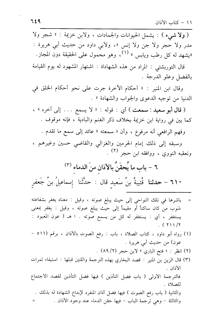 (ولا شيء): يشمل الحيوانات والجمادات، ولابن خزيمة: "شجر ولا مدر ولا حجر ولا جن ولا إنس"، ولأبي داود من حديث أبي هريرة: "يشهد له كل رطب ويابس"، وهو محمول على الحقيقة دون المجاز.