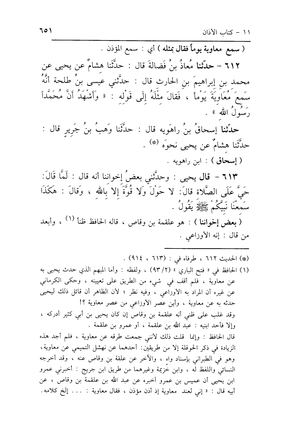 612 - حَدَّثَنَا مُعَاذُ بْنُ فَضَالَةَ، قَالَ: حَدَّثَنَا هِشَامٌ، عَنْ يَحْيَى، عَنْ مُحَمَّدِ بْنِ إِبْرَاهِيمَ بْنِ الحَارِثِ، قَالَ: حَدَّثَنِي عِيسَى بْنُ طَلْحَةَ، أَنَّهُ سَمِعَ مُعَاوِيَةَ يَوْمًا، فَقَالَ مِثْلَهُ، إِلَى قَوْلِهِ: وَأَشْهَدُ أَنَّ مُحَمَّدًا رَسُولُ اللَّهِ.