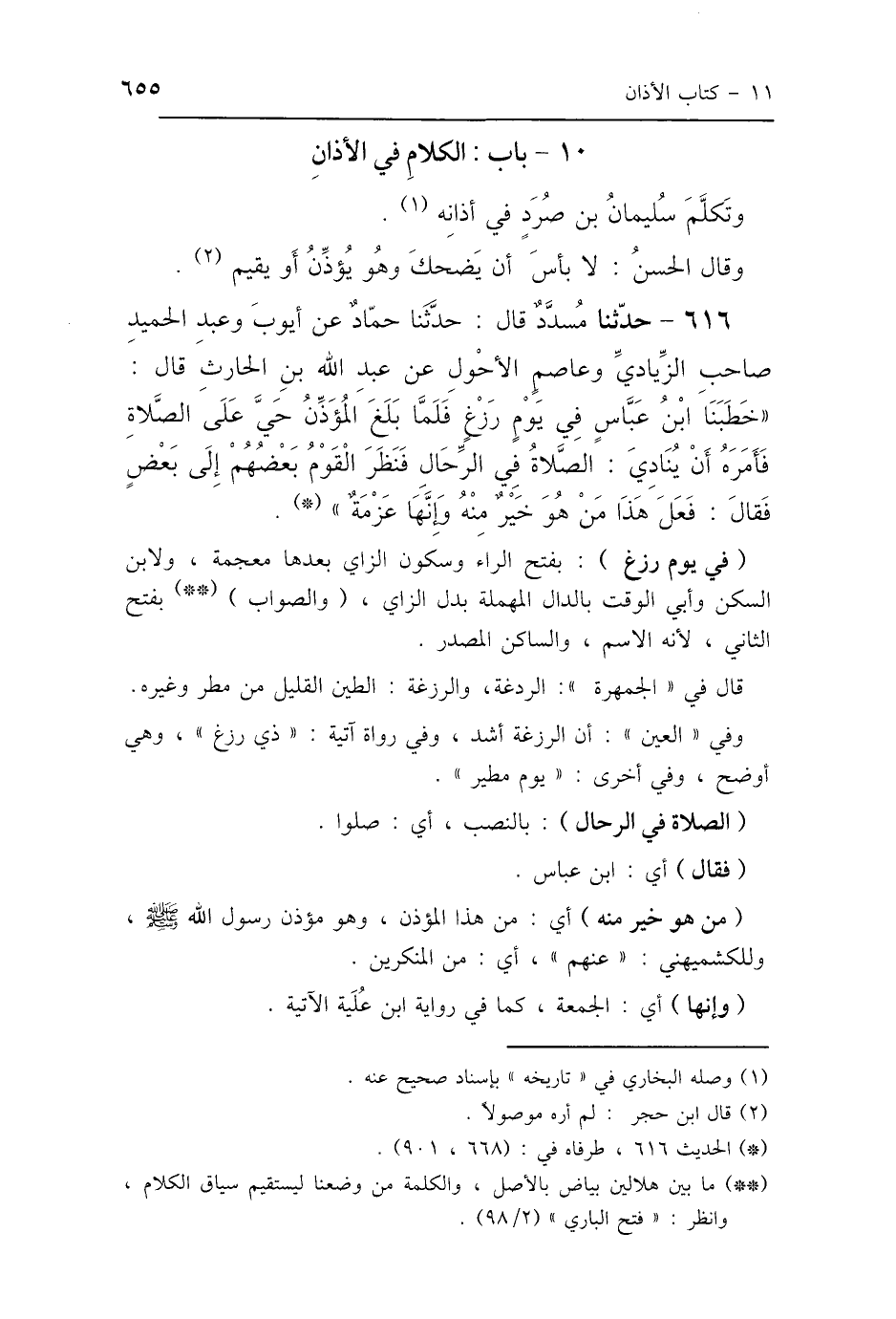 616 - حَدَّثَنَا مُسَدَّدٌ، قَالَ: حَدَّثَنَا حَمَّادٌ، عَنْ أَيُّوبَ، وَعَبْدِ الحَمِيدِ، صَاحِبِ الزِّيَادِيِّ، وَعَاصِمٍ الأَحْوَلِ، عَنْ عَبْدِ اللَّهِ بْنِ الحَارِثِ، قَالَ: خَطَبَنَا ابْنُ عَبَّاسٍ فِي يَوْمٍ رَدْغٍ، فَلَمَّا بَلَغَ المُؤَذِّنُ حَيَّ عَلَى الصَّلاَةِ، فَأَمَرَهُ أَنْ يُنَادِيَ «الصَّلاَةُ فِي الرِّحَالِ»، فَنَظَرَ القَوْمُ بَعْضُهُمْ إِلَى بَعْضٍ، فَقَالَ: «فَعَلَ هَذَا مَنْ هُوَ خَيْرٌ مِنْهُ وَإِنَّهَا عَزْمَةٌ».