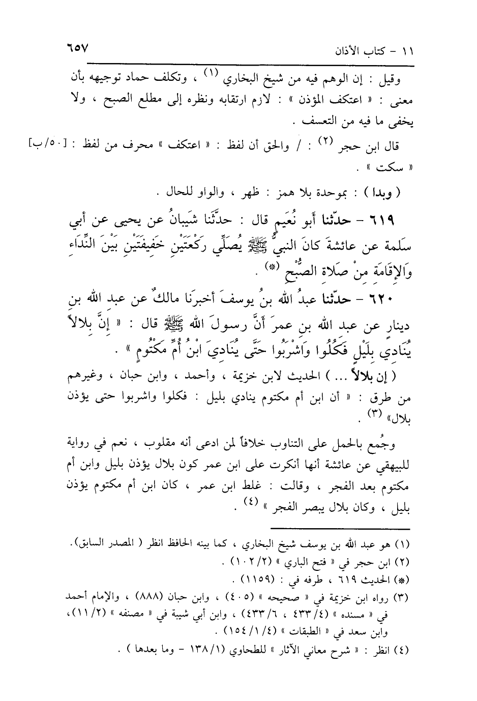620 - حَدَّثَنَا عَبْدُ اللَّهِ بْنُ يُوسُفَ، أَخْبَرَنَا مَالِكٌ، عَنْ عَبْدِ اللَّهِ بْنِ دِينَارٍ، عَنْ عَبْدِ اللَّهِ بْنِ عُمَرَ: أَنَّ رَسُولَ اللَّهِ صَلَّى اللهُ عَلَيْهِ وَسَلَّمَ قَالَ: «إِنَّ بِلاَلًا يُنَادِي بِلَيْلٍ، فَكُلُوا وَاشْرَبُوا حَتَّى يُنَادِيَ ابْنُ أُمِّ مَكْتُومٍ».