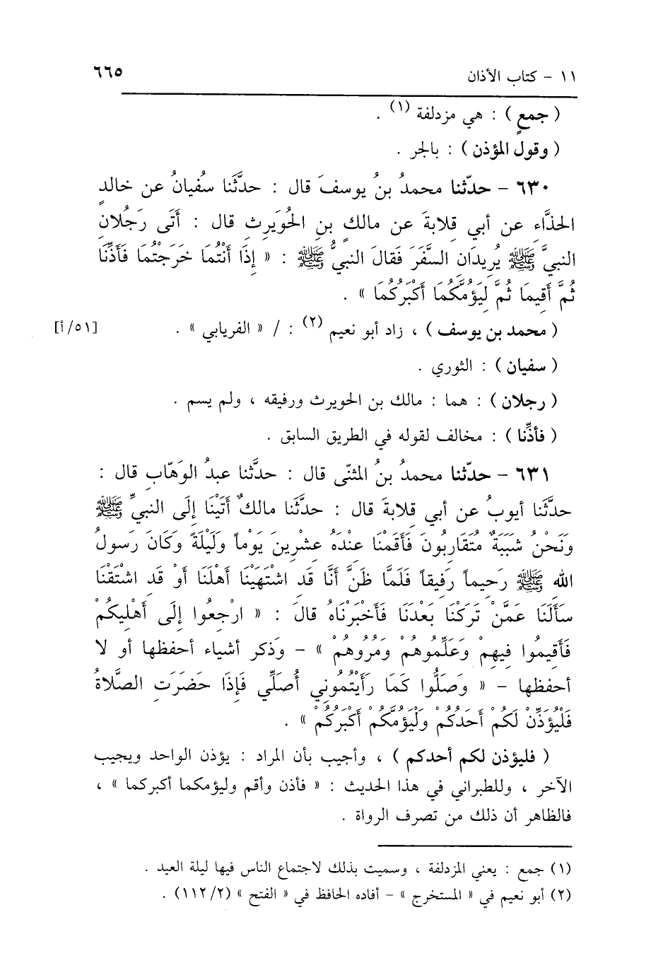 630 - حَدَّثَنَا مُحَمَّدُ بْنُ يُوسُفَ، قَالَ: حَدَّثَنَا سُفْيَانُ، عَنْ خَالِدٍ الحَذَّاءِ، عَنْ أَبِي قِلاَبَةَ، عَنْ مَالِكِ بْنِ الحُوَيْرِثِ، قَالَ: أَتَى رَجُلاَنِ النَّبِيَّ صَلَّى اللهُ عَلَيْهِ وَسَلَّمَ يُرِيدَانِ السَّفَرَ، فَقَالَ النَّبِيُّ صَلَّى اللهُ عَلَيْهِ وَسَلَّمَ: «إِذَا أَنْتُمَا خَرَجْتُمَا، فَأَذِّنَا، ثُمَّ أَقِيمَا، ثُمَّ لِيَؤُمَّكُمَا أَكْبَرُكُمَا».