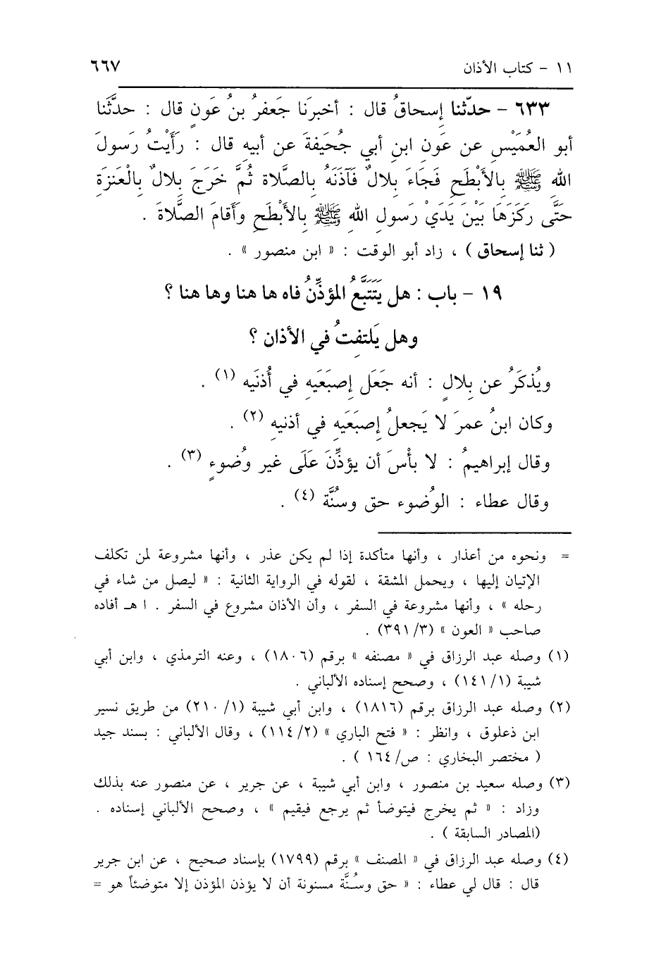 وَيُذْكَرُ عَنْ بِلاَلٍ: «أَنَّهُ جَعَلَ إِصْبَعَيْهِ فِي أُذُنَيْهِ» وَكَانَ ابْنُ عُمَرَ: «لاَ يَجْعَلُ إِصْبَعَيْهِ فِي أُذُنَيْهِ» وَقَالَ إِبْرَاهِيمُ: «لاَ بَأْسَ أَنْ يُؤَذِّنَ عَلَى غَيْرِ وُضُوءٍ» وَقَالَ عَطَاءٌ: «الوُضُوءُ حَقٌّ وَسُنَّةٌ»