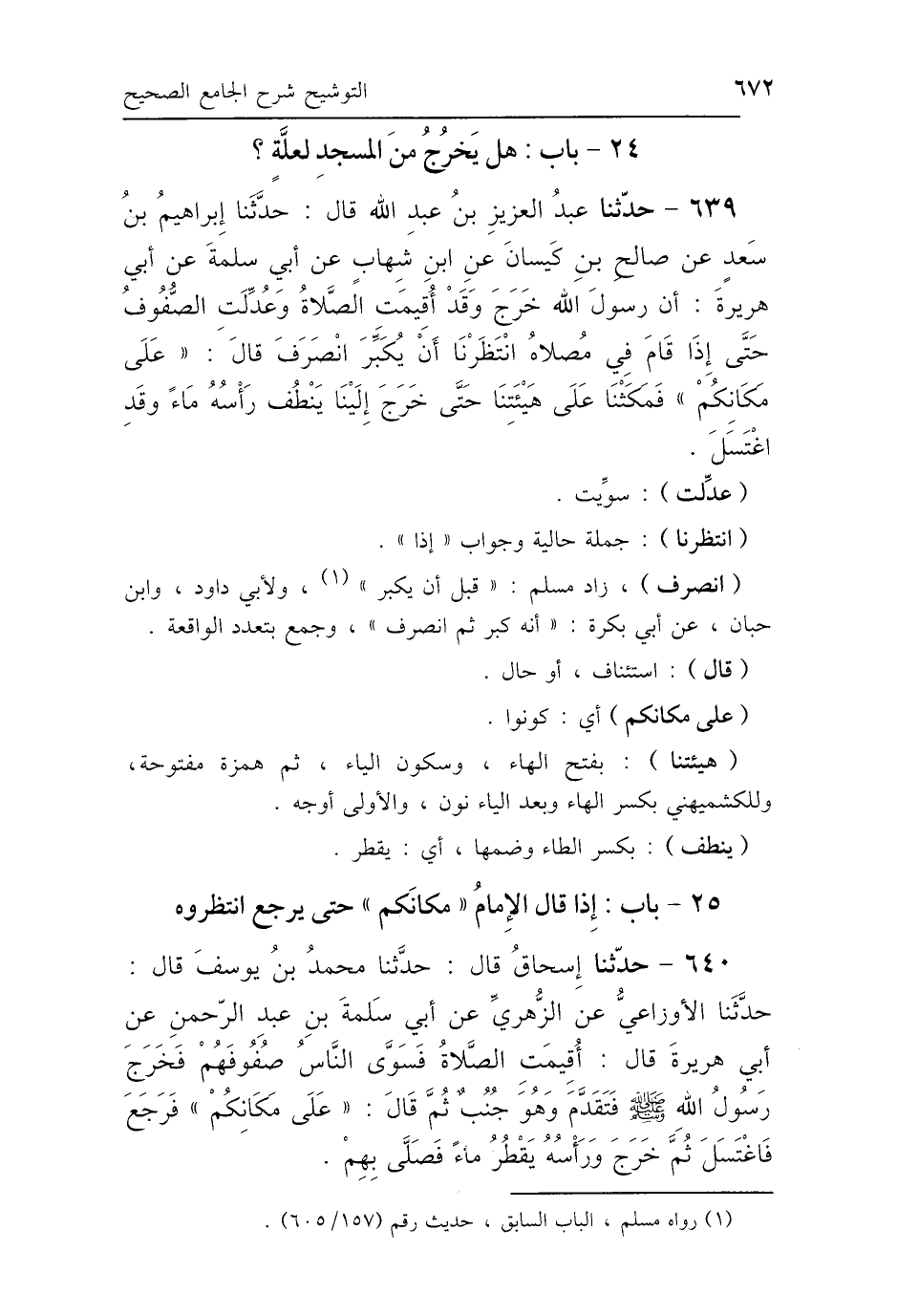 639 - حَدَّثَنَا عَبْدُ العَزِيزِ بْنُ عَبْدِ اللَّهِ، قَالَ: حَدَّثَنَا إِبْرَاهِيمُ بْنُ سَعْدٍ، عَنْ صَالِحِ بْنِ كَيْسَانَ، عَنِ ابْنِ شِهَابٍ، عَنْ أَبِي سَلَمَةَ، عَنْ أَبِي هُرَيْرَةَ: أَنَّ رَسُولَ اللَّهِ صَلَّى اللهُ عَلَيْهِ وَسَلَّمَ خَرَجَ وَقَدْ أُقِيمَتِ الصَّلاَةُ، وَعُدِّلَتِ الصُّفُوفُ، حَتَّى إِذَا قَامَ فِي مُصَلَّاهُ، انْتَظَرْنَا أَنْ يُكَبِّرَ، انْصَرَفَ، قَالَ: «عَلَى مَكَانِكُمْ» فَمَكَثْنَا عَلَى هَيْئَتِنَا، حَتَّى خَرَجَ إِلَيْنَا يَنْطِفُ رَأْسُهُ مَاءً، وَقَدِ اغْتَسَلَ.